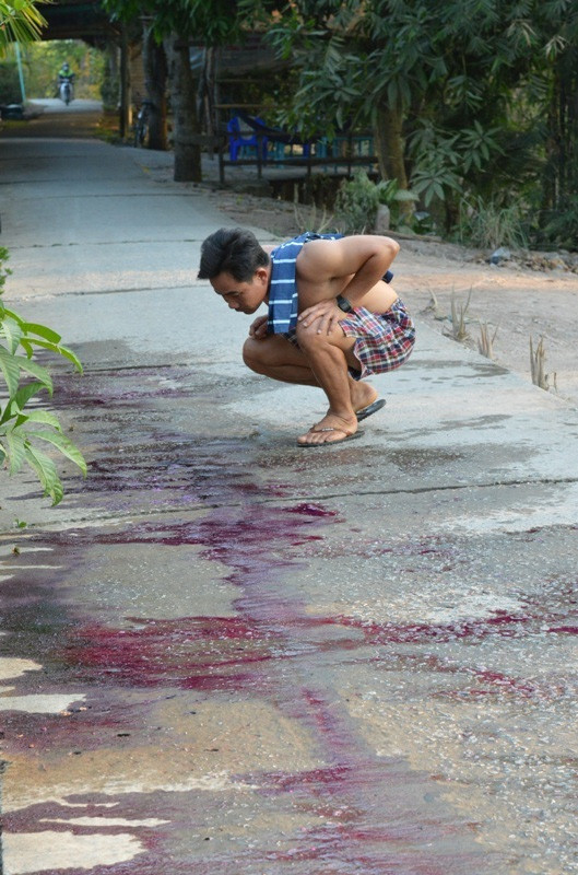 Do lo sợ loại chất này ảnh hưởng đến các em nhỏ nên người dân ở ấp Mỹ Nam 1, Mỹ Nam 2 đã dùng nước tưới lên mặt đường và dùng chổi quét nhiều lần. Đến 15 giờ chiều 24/3, màu tím trên mặt đường đã nhạt dần.