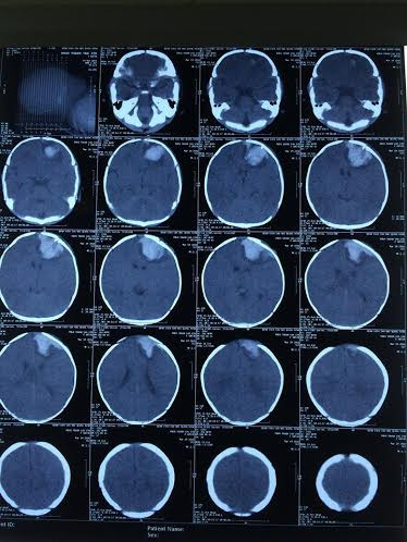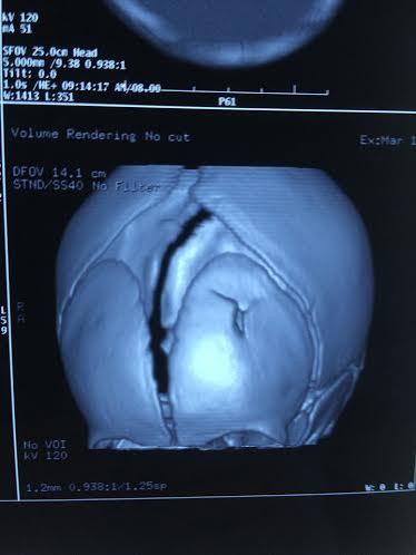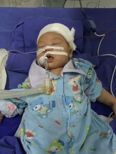 Theo thông tin từ bệnh viện này, bé P.T.V không may bị tai nạn do dao quắm "bập" xuyên vào đầu vùng trán trái và được cấp cứu tại Bệnh viện Đa khoa khu vực Móng Cái. Qua chụp cắt lớp vi tính sọ não các bác sỹ phát hiện, vết thương sọ não gây chảy máu dưới màng cứng, dập não vùng trán trái và được chuyển đến Bệnh viện Sản Nhi tỉnh Quảng Ninh.