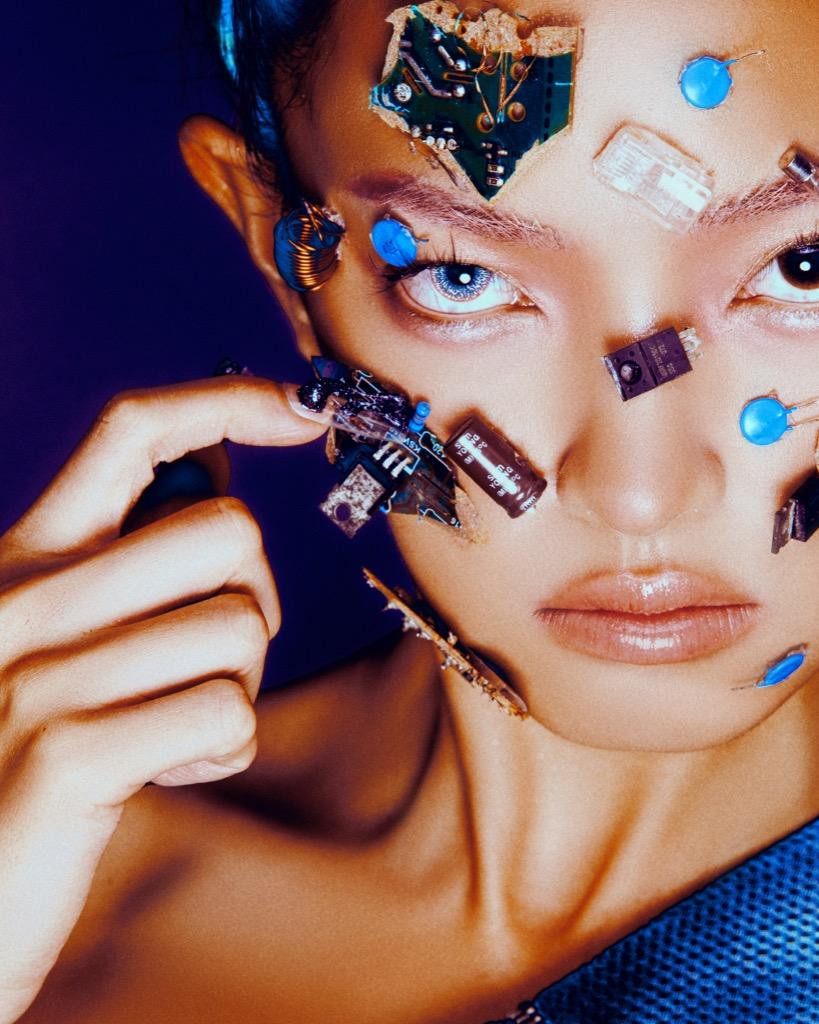 Chia sẻ với Hoa Học Trò Online, Châu Bùi tiết lộ những câu chuyện thú vị khi thực hiện bộ ảnh: “Layout mà Châu thích nhất trong bộ hình này là layout “máy scan nhiệt”. Nhìn mình giống như là nửa người, nửa robot vậy. Để “lắp ráp” các mảnh điện tử lên mặt Châu, ê-kíp đã tính toán số lượng cũng như bố cục để tổng thể được hài hòa nhất. Giúp cho “cô người máy điện tử” này vẫn còn mang được hơi thở của con người".
