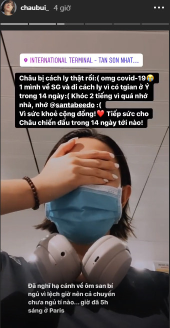 Cụ thể, mới đây Châu Bùi đăng tải trên Instagram một số hình ảnh và clip ghi lại cảnh cô mặc đồ bảo hộ rồi di chuyển đến khu cách ly ở TP. HCM. Đặc biệt có một clip Châu dùng tay che mắt giống như bật khóc và cho biết: "Mình về TP.HCM và đi cách ly vì có thời gian ở Italy trong 14 ngày. Khóc 2 tiếng vì quá nhớ nhà. Vì sức khỏe cộng đồng, tiếp sức cho Châu chiến đấu trong 14 ngày tới nào", cô viết. Đồng thời, chia sẻ với Zing.vn, fashionista này cho biết đang ở cơ quan cảnh sát để khai báo theo thủ tục.