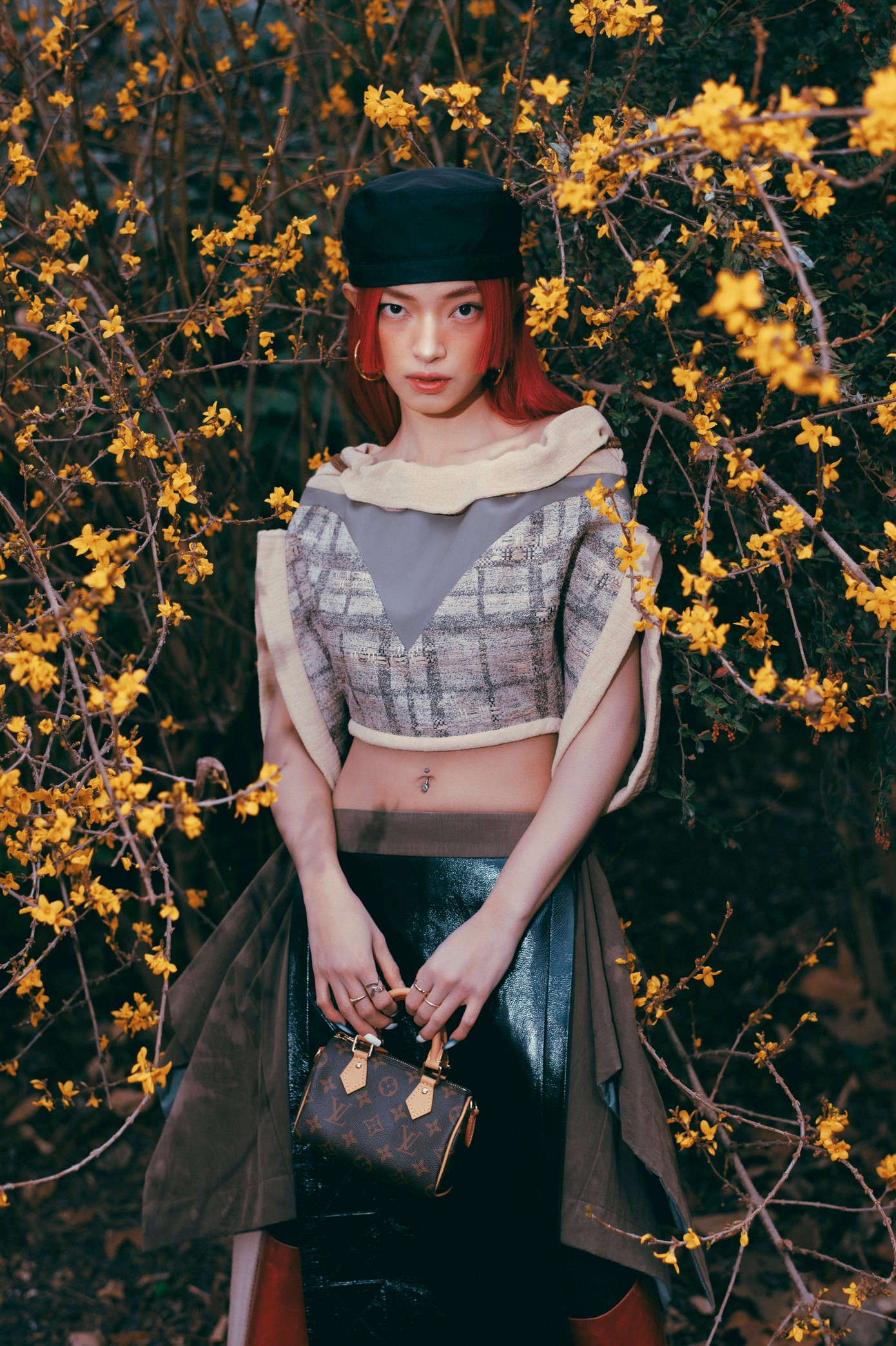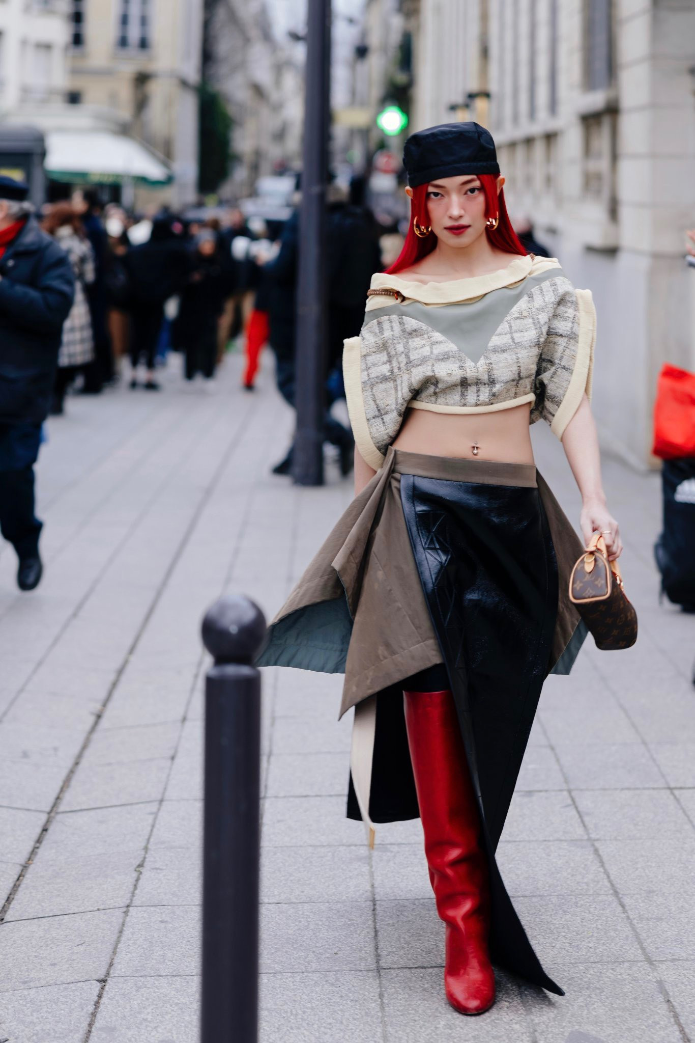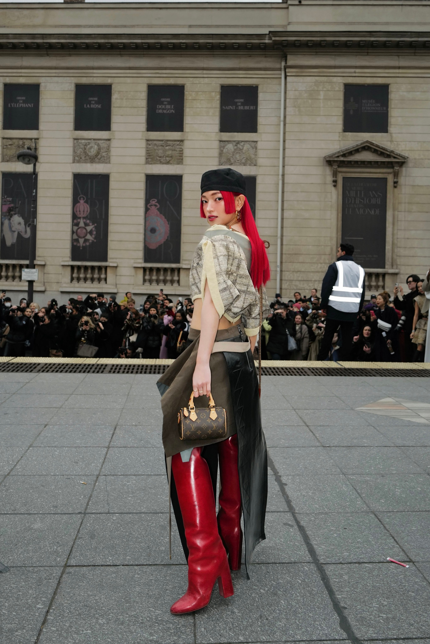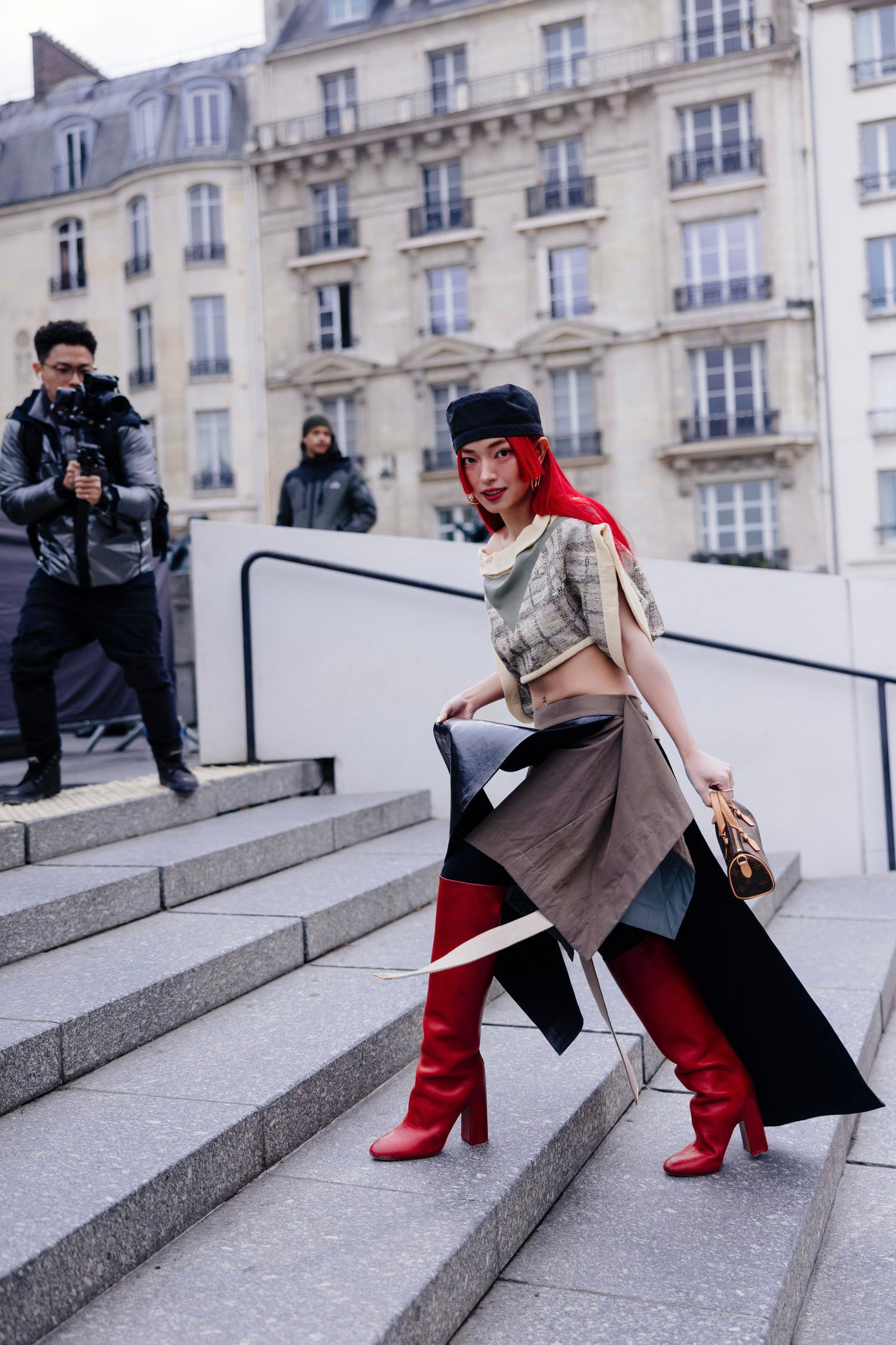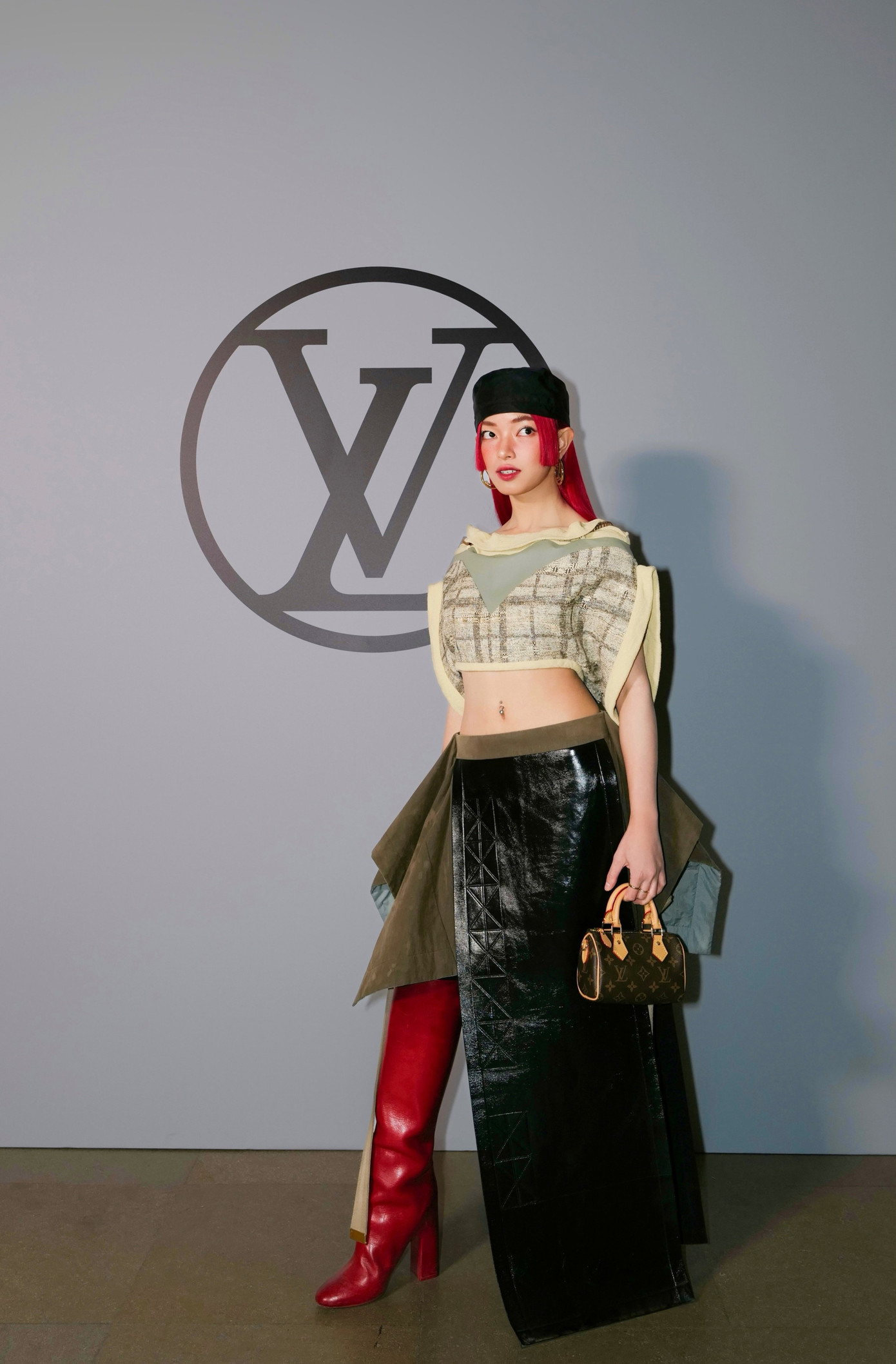 Trang phục Châu Bùi diện để tham dự show diễn lần này thuộc BST Louis Vuitton Resort 2023. Thiết kế áo crop-top kết hợp cùng chân váy da có cấu trúc lạ mắt. Trên tinh thần nữ chiến binh trong thần thoại Hy Lạp, Châu Bùi chọn mái tóc và đôi bốt đỏ làm điểm nhấn.