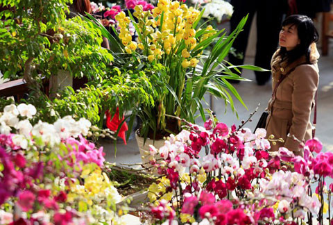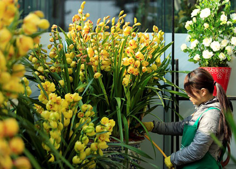 Nhân viên siêu thị hoa chăm sóc đặc biệt cho các chậu địa lan giá chục triệu.
