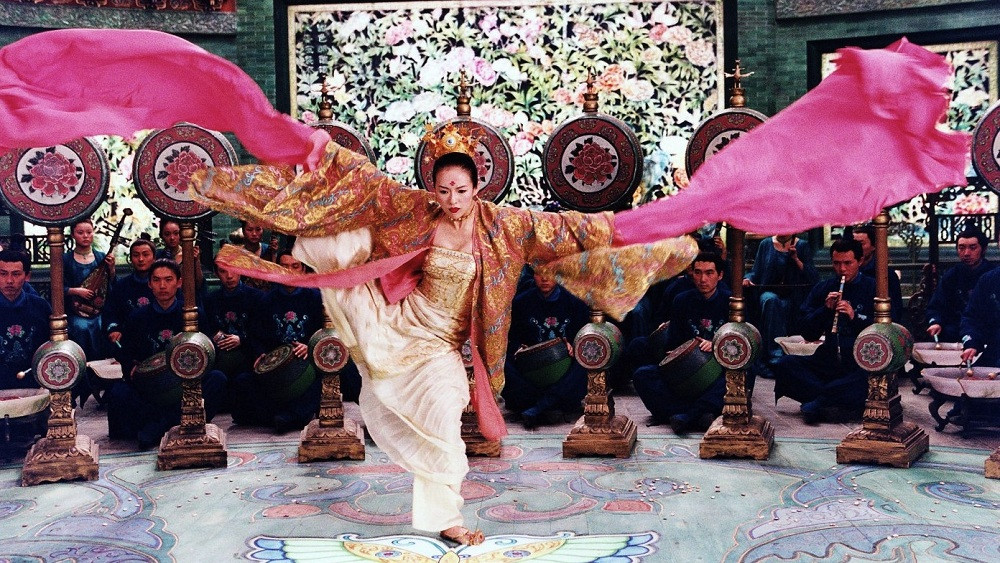 Chương Tử Di thực hiện cảnh võ thuật trong "Ngọa Hổ Tàng Long". (Gif: Weibo) Có thế mạnh học múa từ nhỏ, chuyển động của Chương Tử Di rất uyển chuyển và cho đến nay Chương Tử Di có hai cảnh múa trở thành biểu tượng: Múa gõ trống với dải lụa hồng trong Thập Diện Mai Phục và múa dưới tuyết trong Hồi Ức Một Geisha.