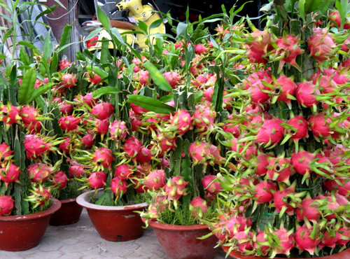 Có nhiều mức giá hàng đầu trong dòng kiểng trái cây chưng Tết chính là thanh long vô chậu. Tương tự như mọi năm, thanh long cảnh có nhiều kích cỡ khác nhau, được xác định bằng lượng quả mỗi chậu như: 9, 12, 26, 28, 39-79, 68-86 và 99, từng số lượng được giải thích bằng một ý nghĩa tốt lành khác nhau. Tương ứng với các số lượng này, giá bán tại các nhà vườn Kiên Giang, Tiền Giang dao động từ 250.000 đồng đến 3 triệu đồng mỗi chậu. Trong khi đó, giá bán lẻ được các đại lý giới thiệu trên Internet hiện "nhảy múa" ở nhiều mức khác nhau trong cùng một kích cỡ. Đặc biệt, dịp Tết Đinh Dậu năm nay còn có cả thanh long chậu loại đặc biệt 168 quả với giá bán lẻ đang được đề nghị hơn 10 triệu đồng. Ngoài ra, còn có dòng thanh long vô chậu tạo hình thú, đặc biệt là hình tượng con gà. Tuy nhiên, vì lý do bảo mật nên hình ảnh về thanh long hình gà vẫn được chưa nhà vườn công bố.