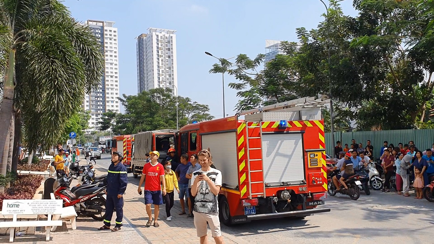 Nghe tiếng chuông báo cháy, hàng trăm cư dân từ trên tầng cao hốt hoảng tháo chạy xuống đất. Lực lượng chữa cháy tại chỗ cũng nhanh chóng có mặt tìm cách dập lửa.