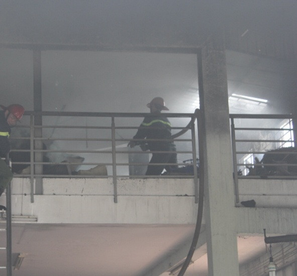 Trong lúc công nhân đang làm việc, họ phát hiện có khói bốc lên nghi ngút từ phía cầu thang. Hàng chục công nhân cùng bảo vệ hô hoán nhau dùng bình chữa cháy mini dập lửa, nhưng không thành.