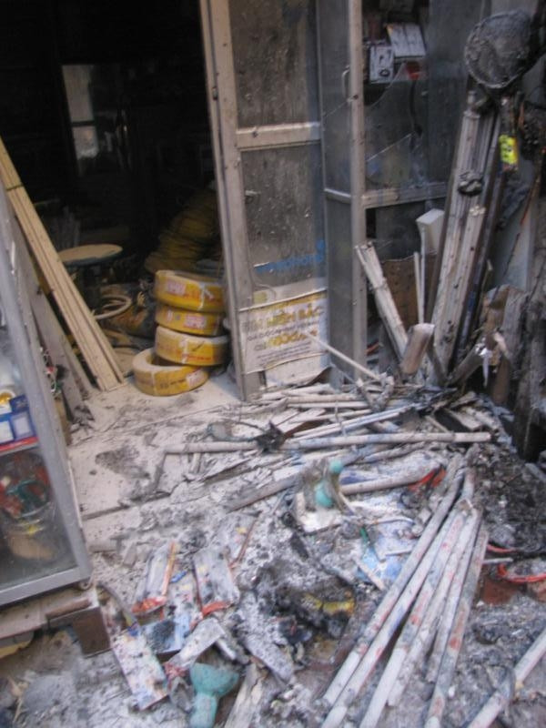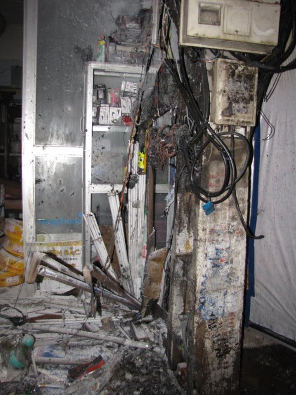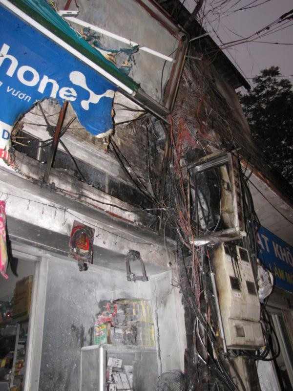Đặc biệt, ngôi nhà số 303 là cửa hàng giặt là, còn nhà số 305 là cửa hàng bán đồ điện và sim thẻ. Vì thế, các đồ dùng trên nhanh chóng bắt điện và bốc cháy. Ngay khi phát hiện cột điện cháy, một cháu đang học cấp hai ở nhà 303 và hai mẹ con ở nhà 305 đã kịp thời chạy ra ngoài thoát thân.