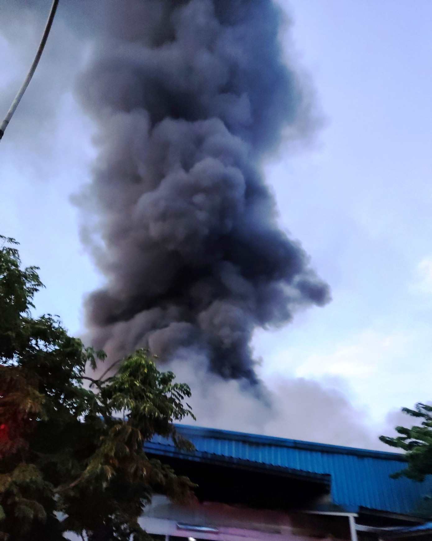 | Khu vực nhà xưởng xảy ra hỏa hoạn có diện tích khoảng 1,2ha. Tại đây có các trang thiết bị máy móc, nguyên vật liệu, hàng hóa phục vụ cho việc sản xuất quần áo các loại. Trong ảnh: Những cột khói bốc cao hàng chục mét |