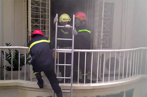 Lính cứu hỏa bắc thang lên tầng trên của căn nhà, kéo vòi rồng phun nước xối xả khống chế ngọn lửa. Hơn một giờ sau đám cháy được dập tắt. Hỏa hoạn đã khiến nhiều đồ đạc trong khách sạn bị thiêu rụi.