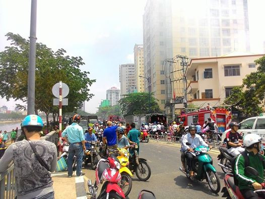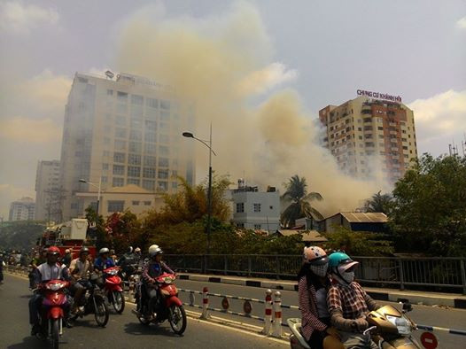 Ngọn lửa bùng lên dữ dội, cột khói bốc cao cả một góc trời và che lấp chung cư Khánh Hội và Khánh Hội 3.