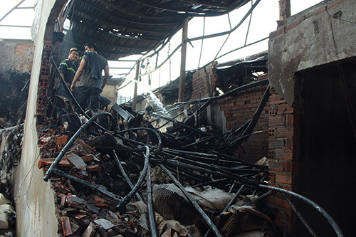 Cảnh sát PCCC quận 12 đập tường nhà xưởng liền kề để cô lập đám cháy, tìm cách cứu người. Hơn một giờ sau, khi đám cháy được dập tắt, cảnh sát phát hiện thi thể nam công nhân.