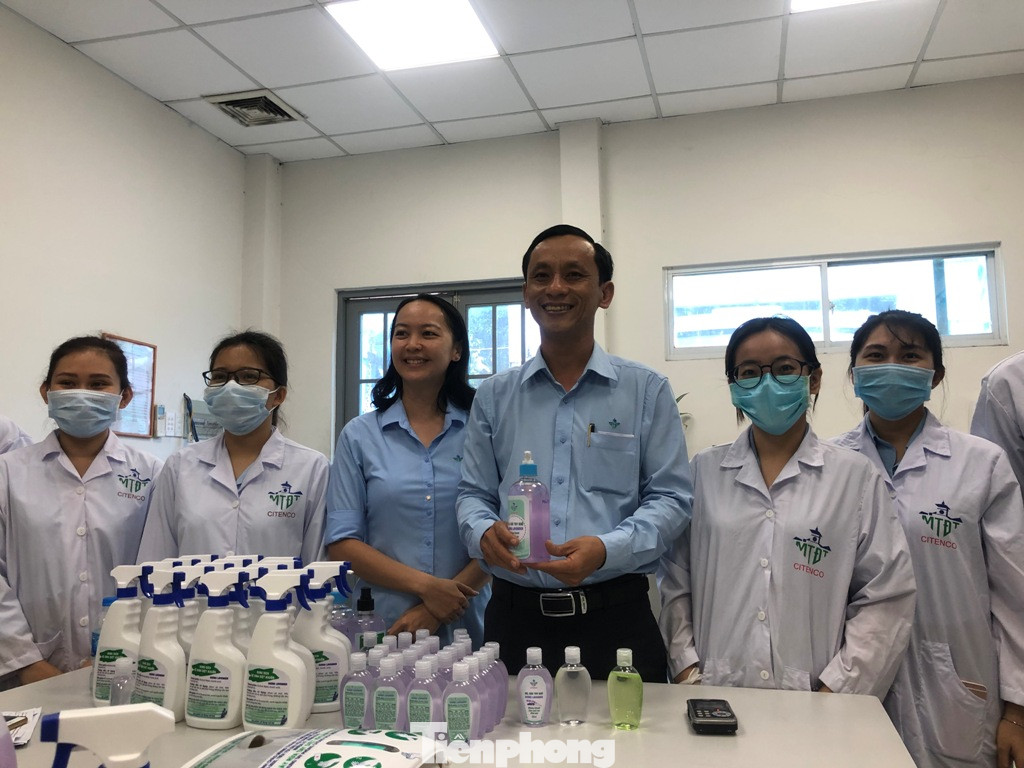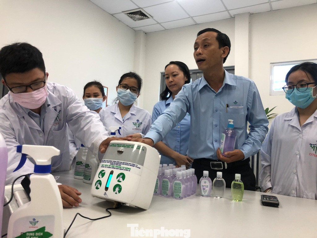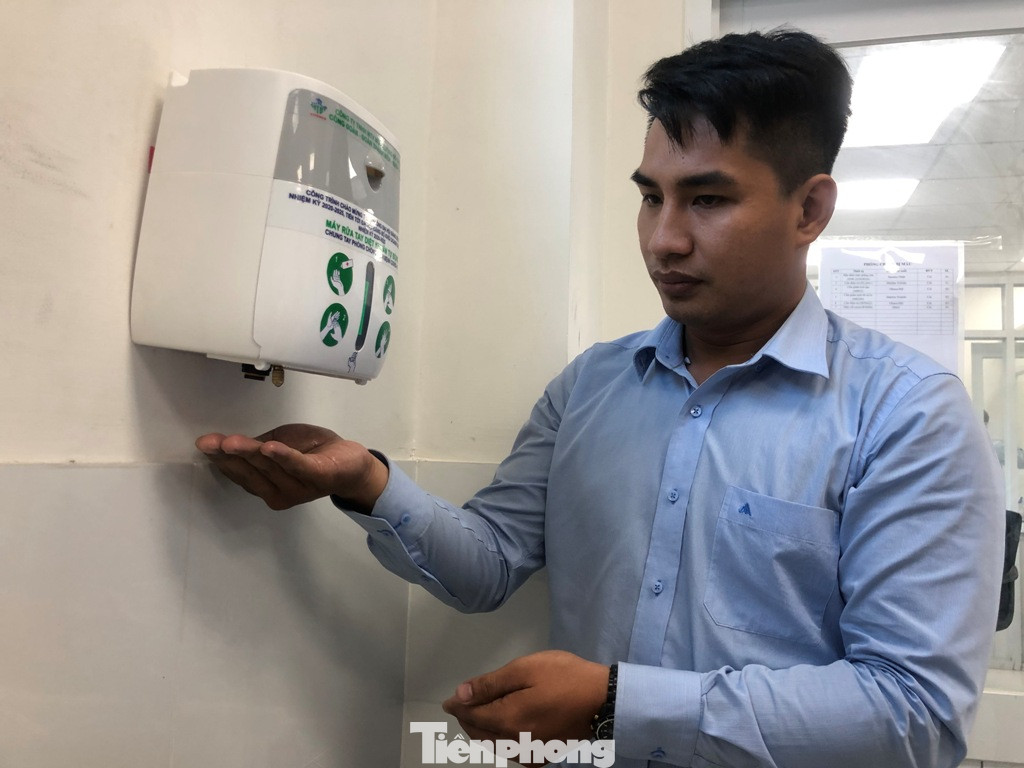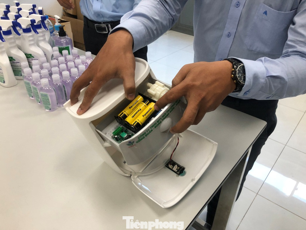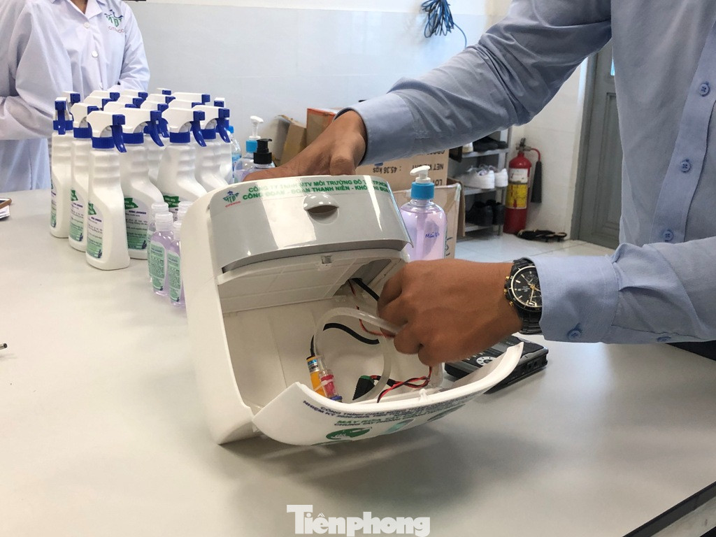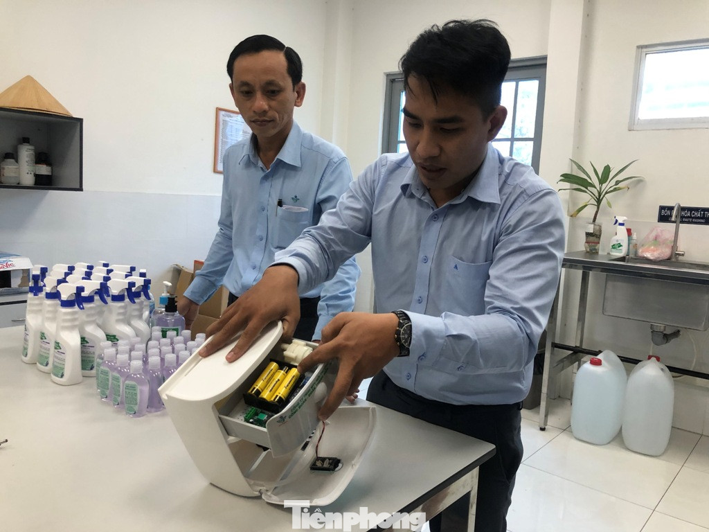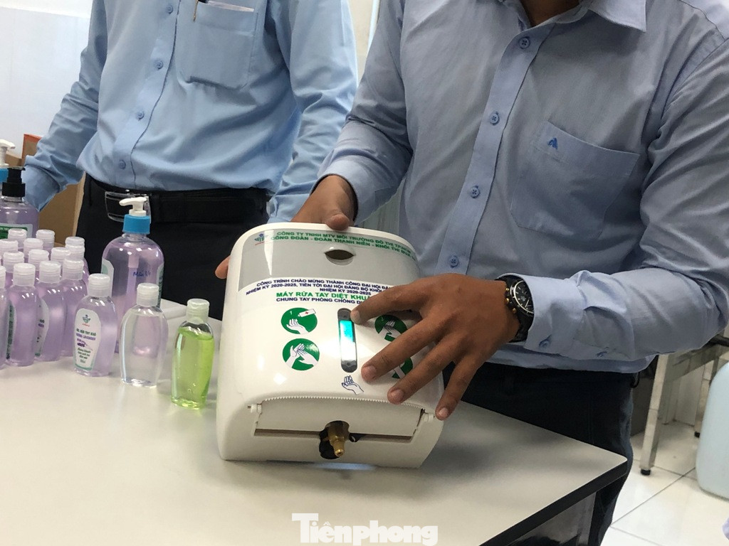Ông Cao Văn Tuấn, Trưởng phòng Công nghệ môi trường và Kiểm tra chất lượng chia sẻ: "Đây là sản phẩm do công ty nghiên cứu. Người dùng chỉ cần đưa tay vào máy là nước sát khuẩn sẽ tự động xịt ra lượng vừa đủ để làm sạch tay. Sản phẩm được gắn ở nhiều nơi trong công ty, các đơn vị trực thuộc để công nhân, nhân viên luôn ý thức sát khuẩn tay sạch sẽ phòng dịch bệnh".