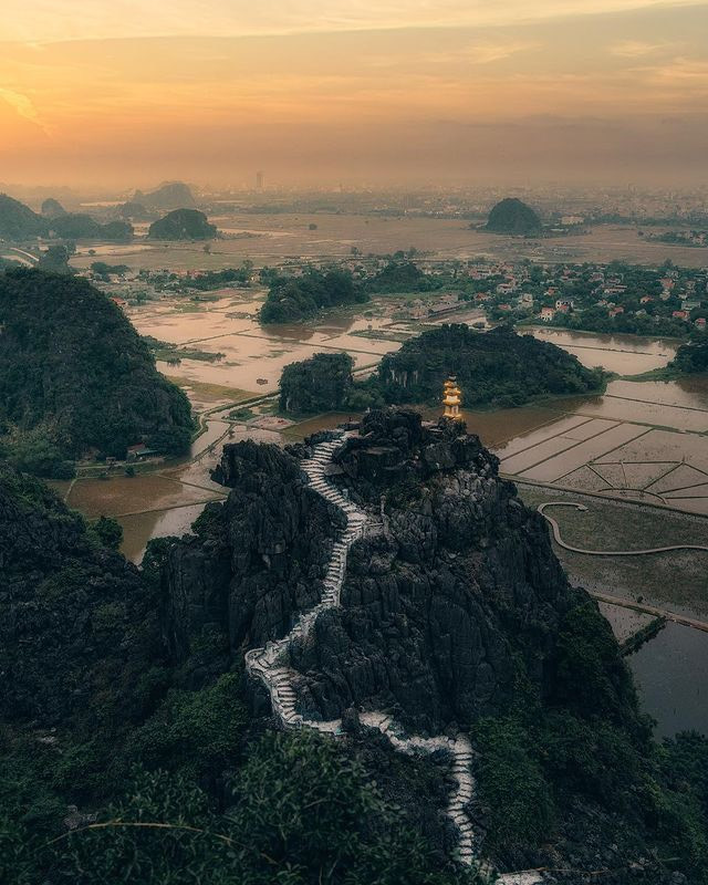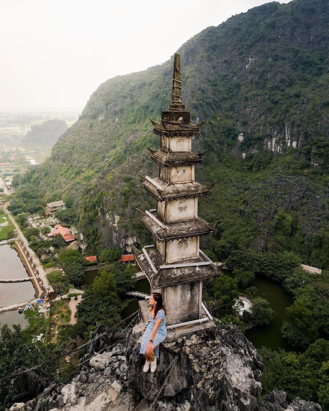 Thế nhưng, trước khi được chiêm ngưỡng cảnh sắc tuyệt đẹp như vậy, du khách sẽ cần chinh phục 486 bậc đá rêu phong mô phỏng kiến trúc Vạn lý trường thành mới có thể lên được tới đỉnh núi Múa.Trên đỉnh núi Ngọa Long còn có điểm nhấn với tượng Phật Bà Quân Âm cùng rồng chầu trên đỉnh núi, hình ảnh được bình chọn là đẹp nhất Ninh Bình khi hoàng hôn.