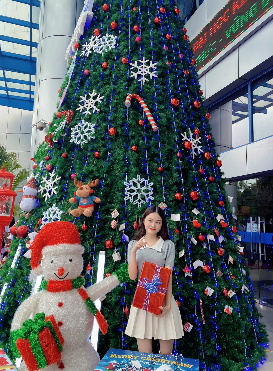 Là sinh viên năm nhất trường Đại học Kinh tế Quốc dân, Phạm Thị Ngọc Anh (sinh năm 2004) rất háo hức khi thấy trường mình trang trí hẳn một cây thông Noel khổng lồ sặc sỡ, cùng với đó là rất nhiều góc “check-in” khác của các khoa, các viện.