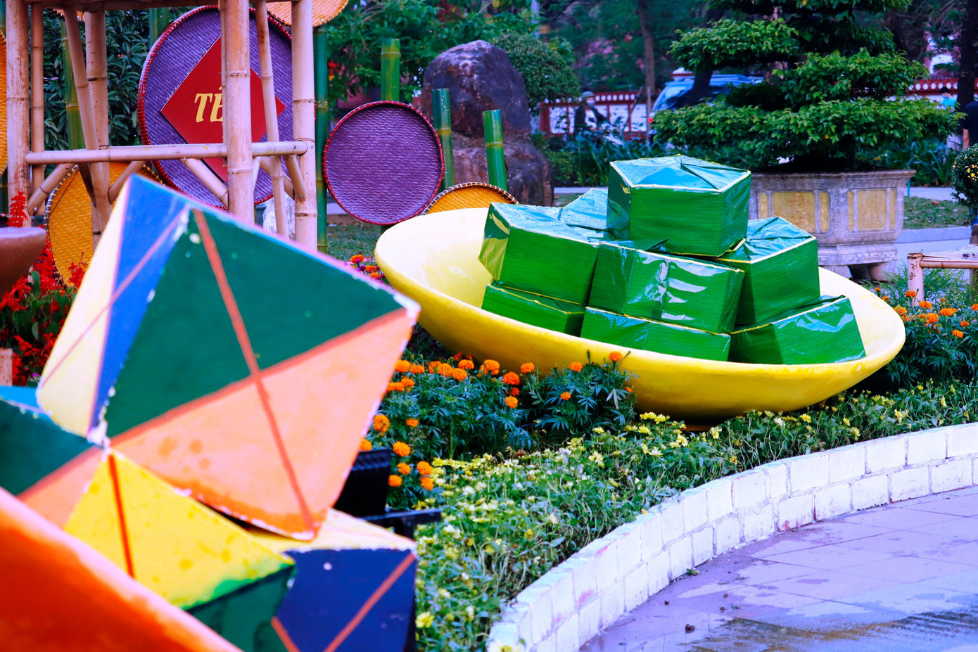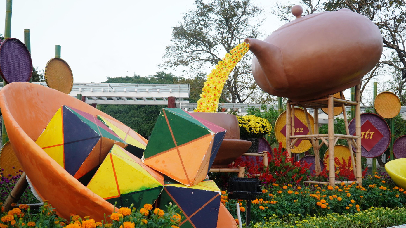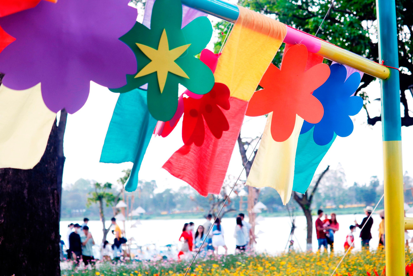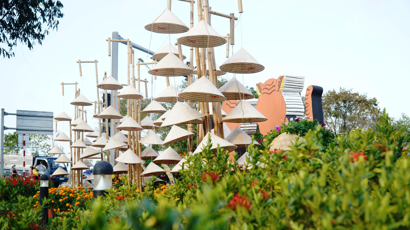| Một cụm tác phẩm nghệ thuật sắp đặt lấy cảm hứng từ những chiếc nón lá Huế trữ tình cạnh sông Hương là nơi người dân, giới trẻ, khách du xuân thường xuyên lui tới để check in, chụp hình lưu niệm |