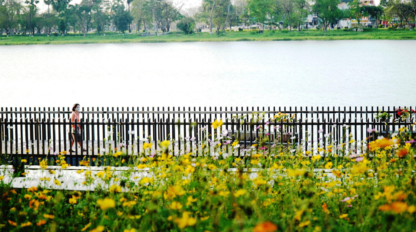 | Lối đi đầy hoa lá giữa công viên Lý Tự Trọng dọc đường Lê Lợi ven sông Hương xứ Huế |