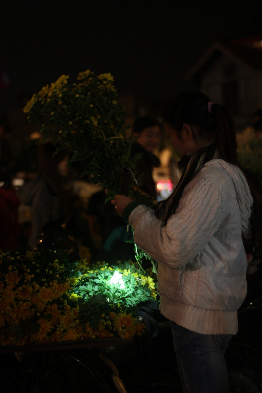 Nhiều chị em phụ nữ còn phải trang bị đèn pin để mua được hoa đẹp trong điều kiện ánh sáng mù mờ.