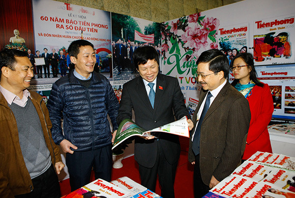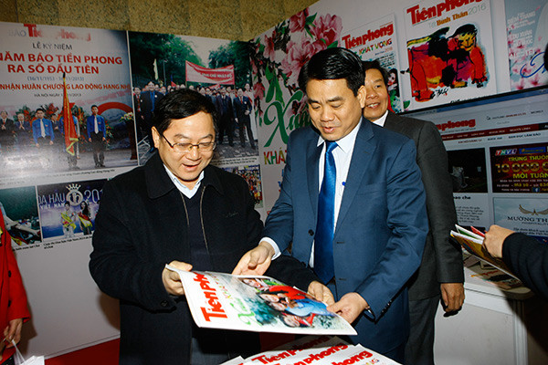 Ông Lê Xuân Sơn (trái) Tổng Biên tập báo Tiền Phong giới thiệu ấn phẩm đặc biệt tết Bính Thân của Báo Tiền Phong với Ông Nguyễn Đức Chung - Ủy viên TƯ Đảng - Chủ tịch UBND TP Hà Nội.