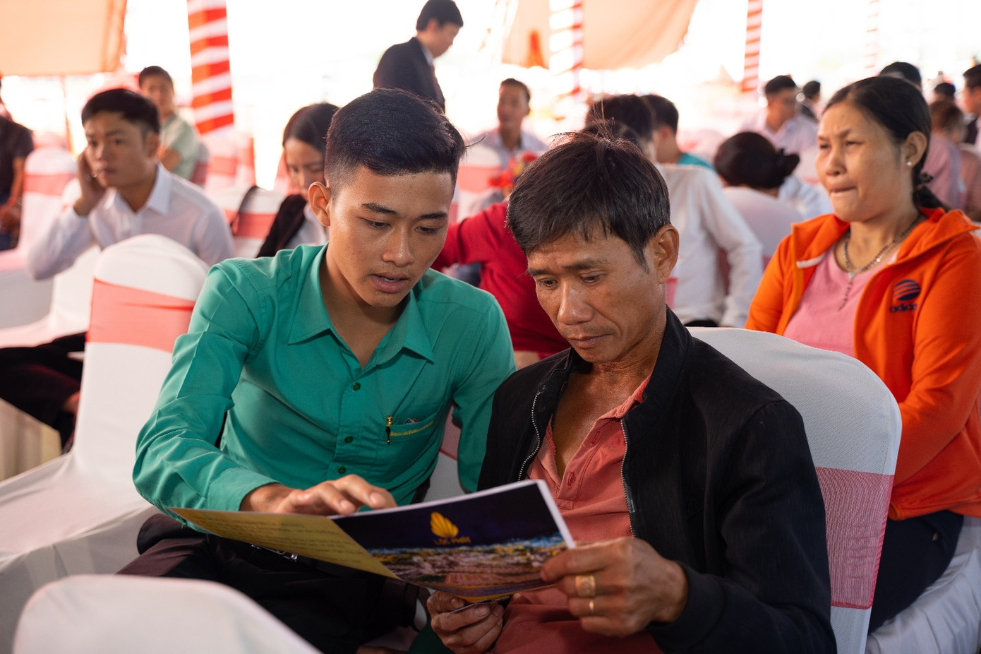 Nhân viên kinh doanh hướng dẫn khách hàng bỏ phiếu rút thăm may mắn vào thùng để tham gia chương trình khuyến mãi. Được biết, Phố thương mại Lộc Phát có giá cạnh tranh chỉ 560 triệu đồng/nền, thanh toán linh hoạt.