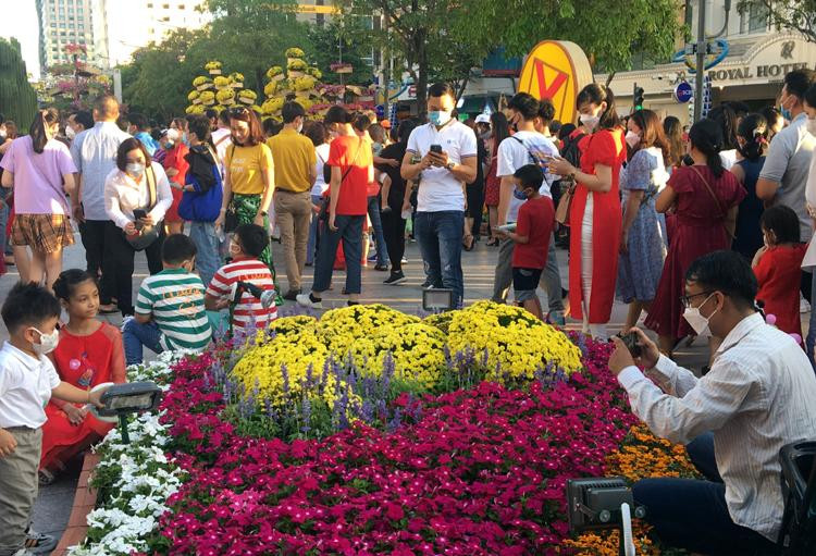 | Anh Nhất Hoàng (ngụ thành phố Thủ Đức) chia sẻ: “Năm nay, gia đình tôi không về quê, vì vậy tôi đưa vợ con đi du xuân, tham quan chụp ảnh ở đường hoa. Dù đông nhưng hầu hết mọi người đều đeo khẩu trang nên cũng yên tâm”. |