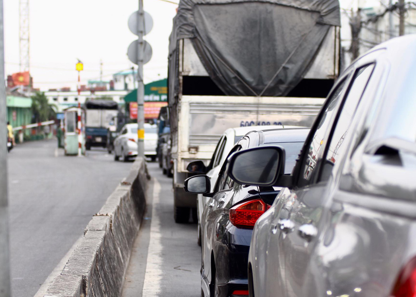 Do bến phà chỉ hoạt động vào hai khung giờ cố định và mỗi chuyến phà chỉ chở không quá 50% sức chứa nên dòng xe nối đuôi nhau chờ ở hai bên đầu phà.