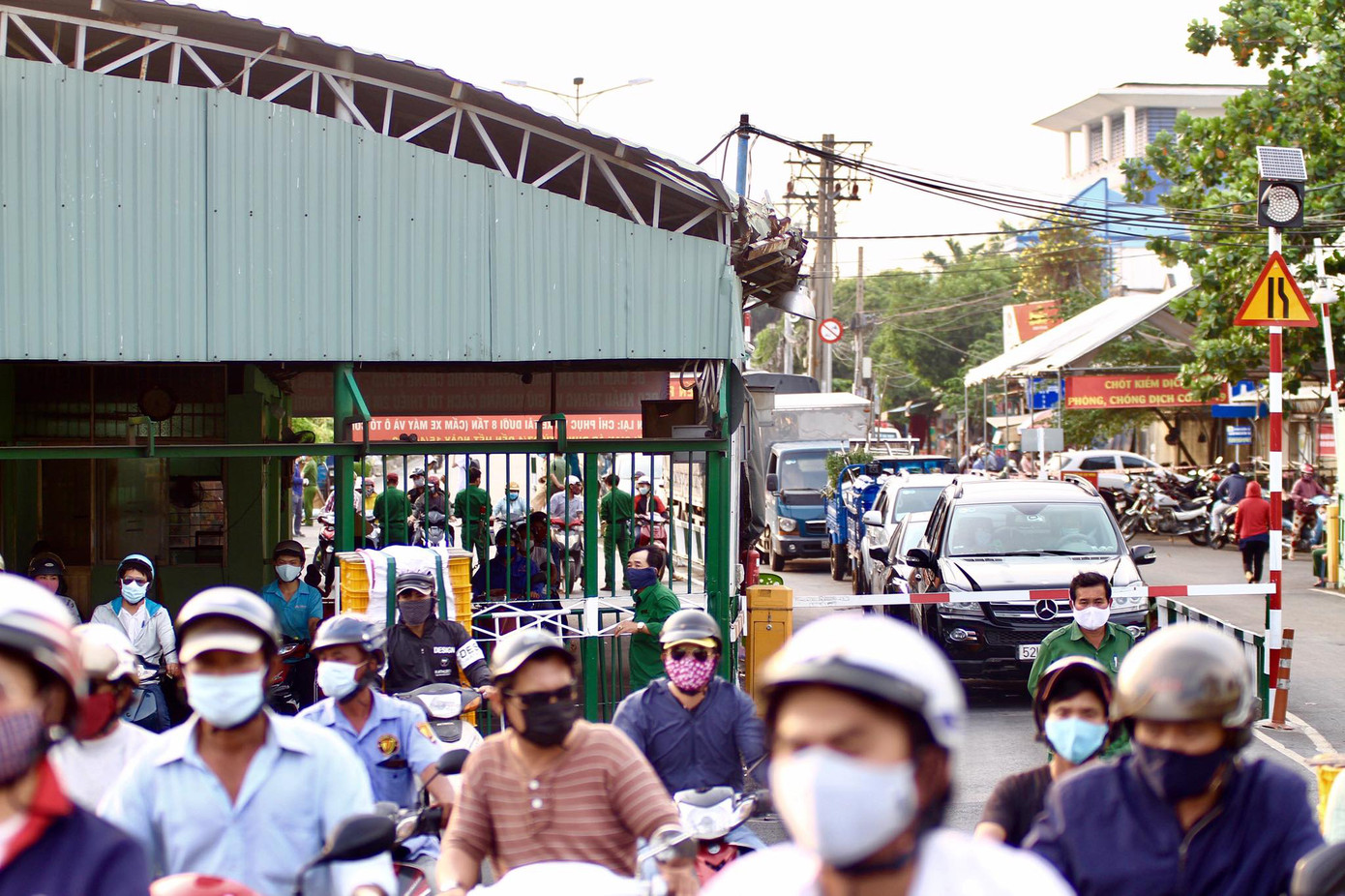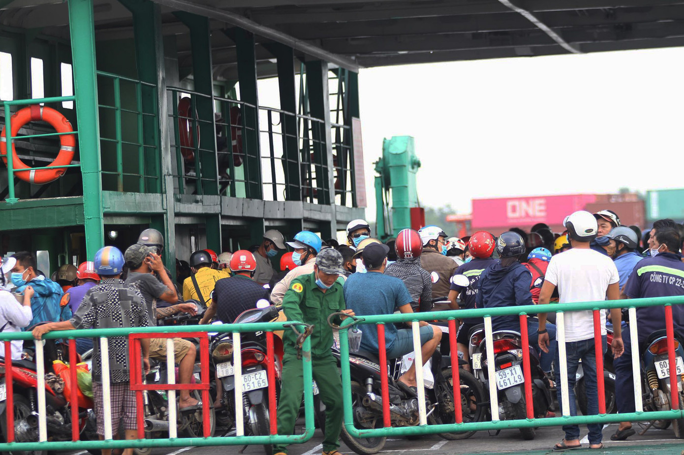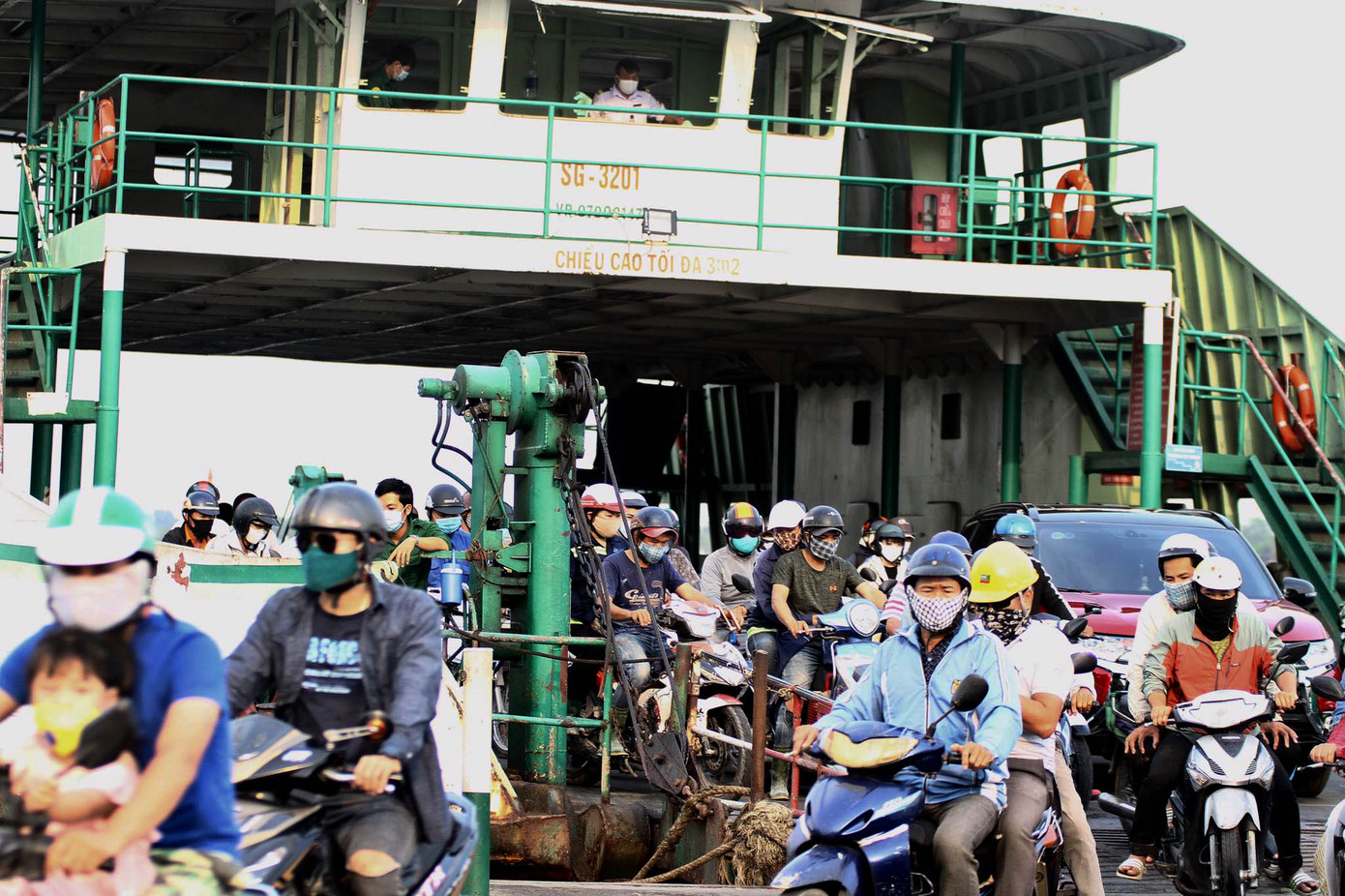 Người dân dồn đến trong hai khung giờ sáng-chiều khiến các chuyến phà luôn trong tình trạng đông đúc, khó giữ khoảng cách 2m để phòng dịch COVID-19.