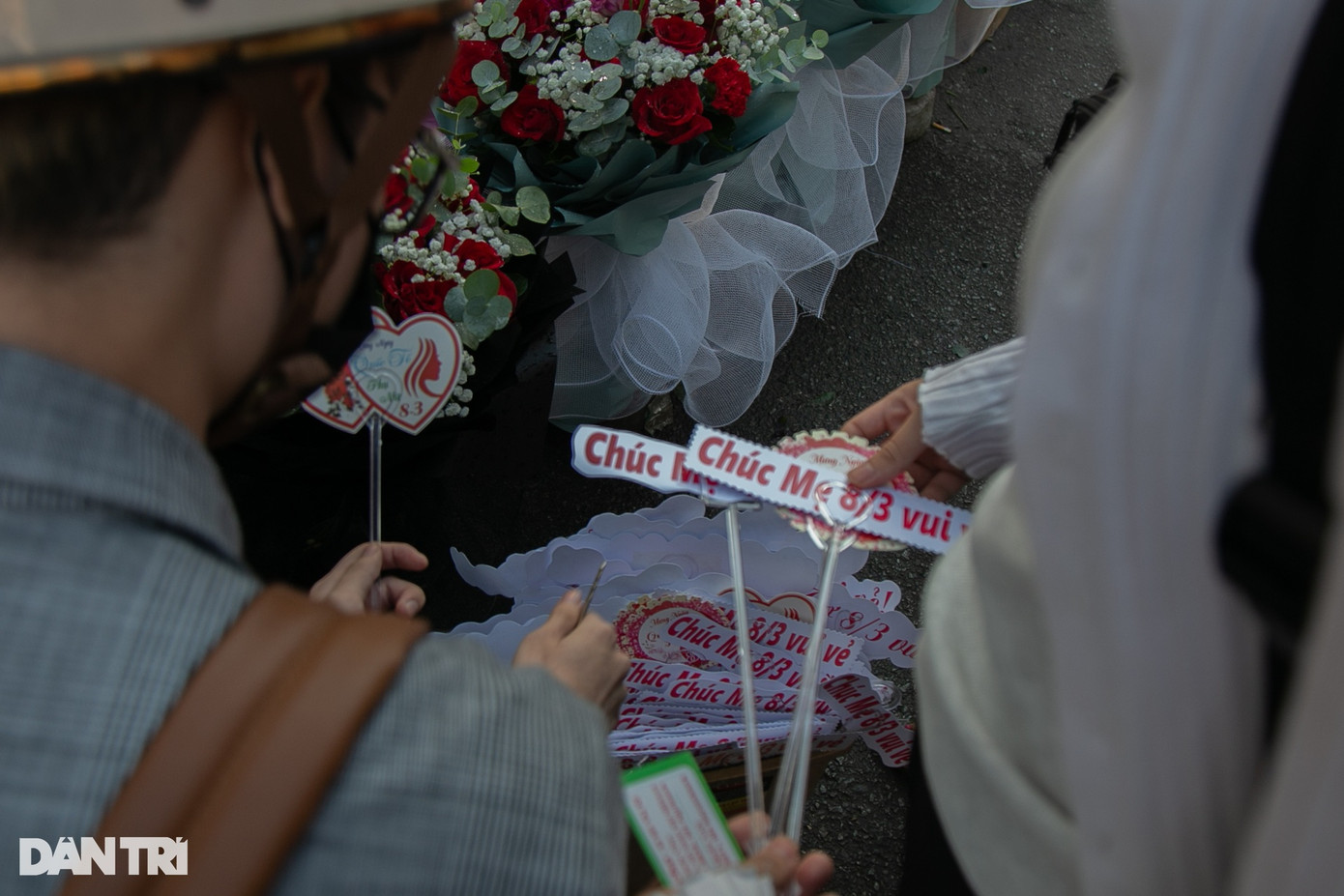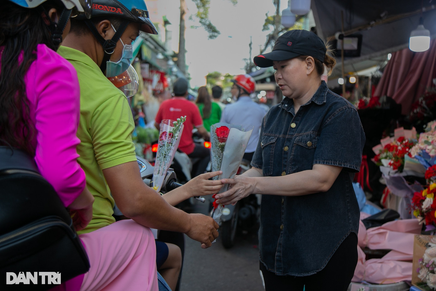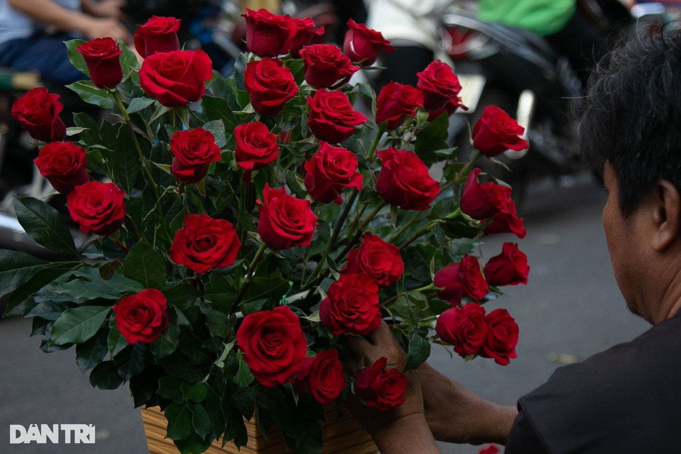 Anh Nghĩa (43 tuổi) cũng mua hoa tặng đồng nghiệp nữ ở văn phòng. "Năm nay chợ nhộn nhịp hơn hẳn, người bán bày nhiều hoa hơn so với năm ngoái. Hoa này tôi mua cho đồng nghiệp, còn hoa cho bà xã tôi đã đặt riêng", anh kể.