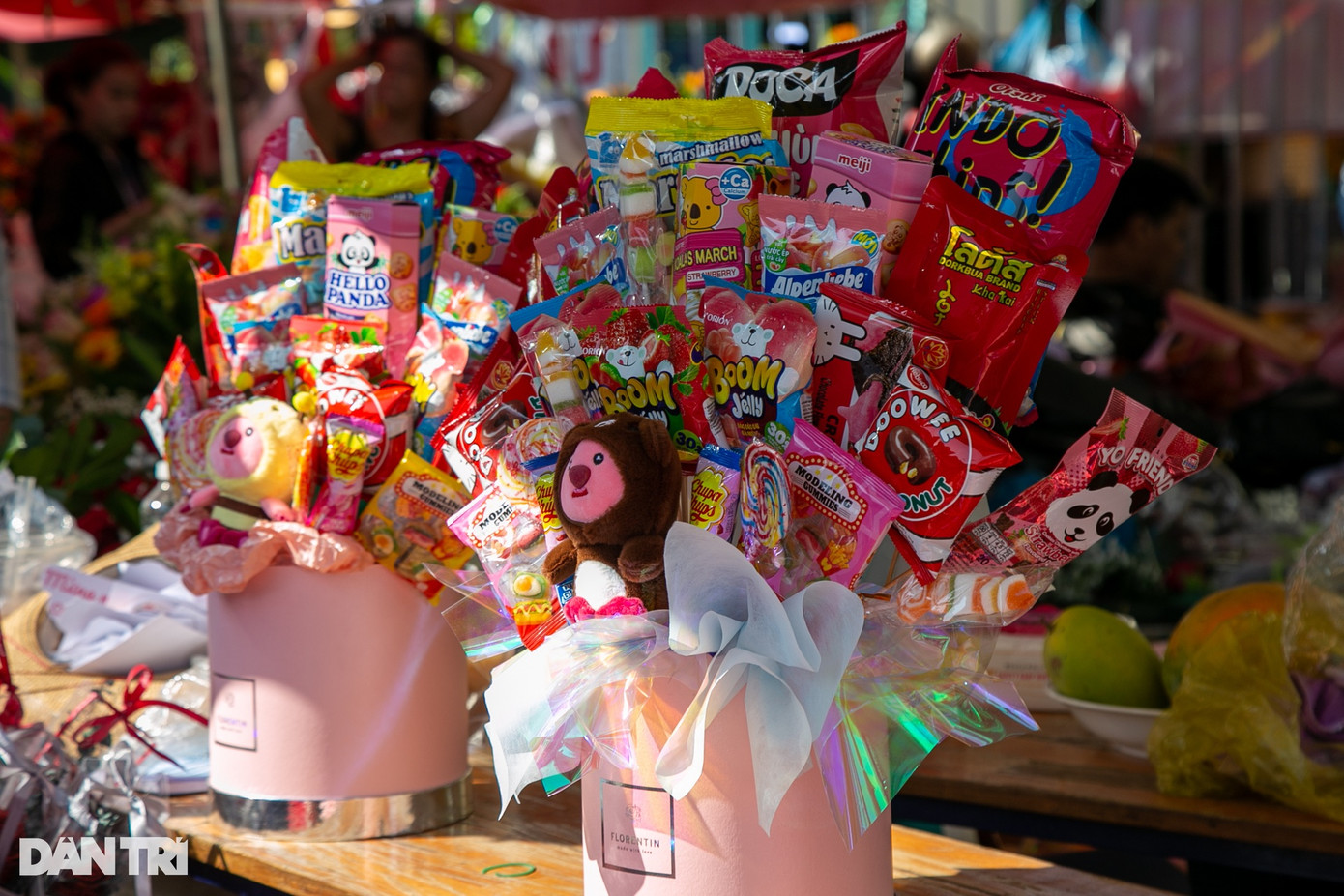 Ngoài tặng hoa tươi, những giỏ hoa bằng bánh kẹo cũng không kém phần đắt khách. Hai phần hoa bánh kẹo có giá 500.000 đồng/phần, đã có người đặt hàng. Chị chủ tiệm hoa cho biết chỉ riêng dịp lễ 8/3, cô đã chuẩn bị 500 set quà như thế. Nếu khách có nhu cầu đặt hàng thì chị sẽ làm và giao trong ngày.