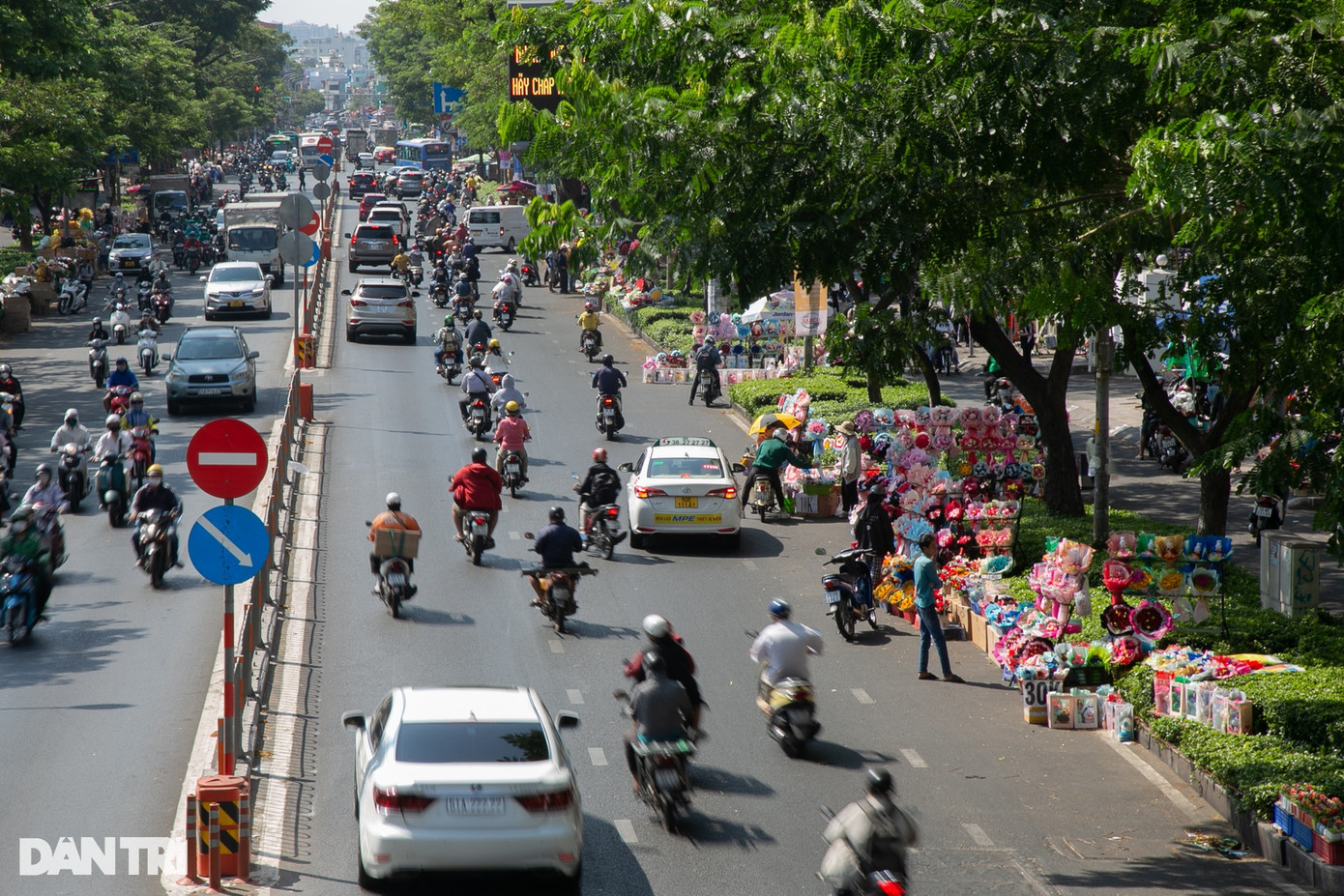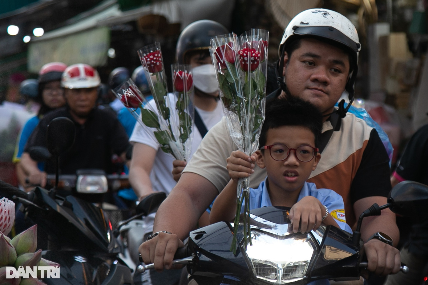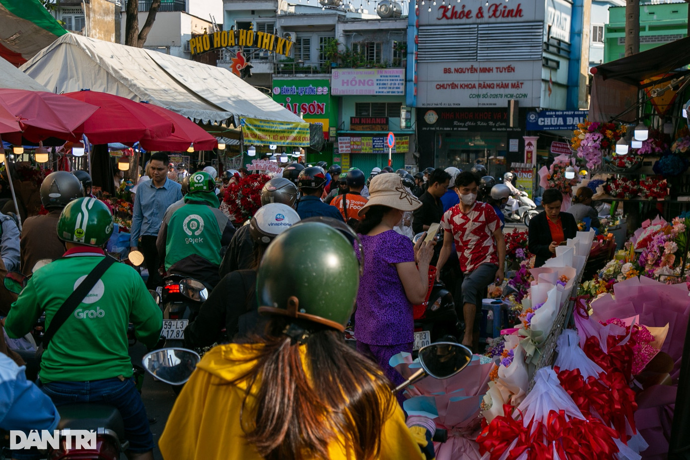 Từ sáng sớm, chợ hoa Hồ Thị Kỷ (quận 10) đã chật cứng khách. Người, xe chen nhau nhích từng chút một để tranh thủ mua hoa tươi.