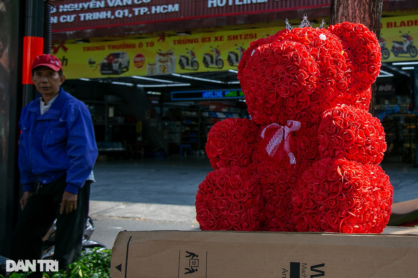 Mặt hàng chủ yếu ở con đường Nguyễn Văn Cừ là hoa sáp, gấu bông, những bó hoa nhỏ với giá thành rẻ, từ 30.000-50.000 đồng, phù hợp với học sinh, sinh viên tại khu vực.