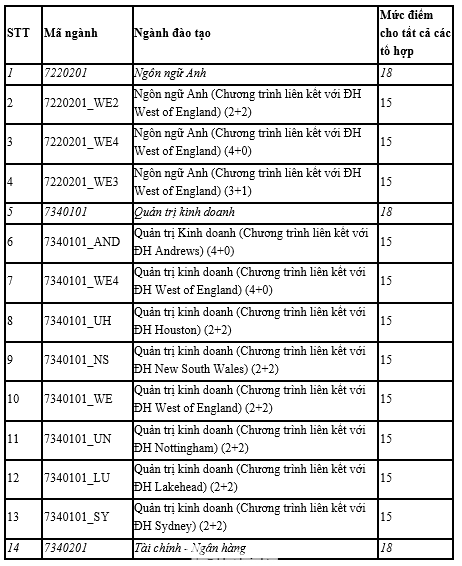 Còn tại Trường ĐH Quốc tế- ĐHQG TPHCM, mức điểm sàn chung cho 23 ngành đào tạo đại học do trường cấp bằng sẽ là 18 điểm còn mức điểm sàn chung cho các nhóm ngành thuộc chương trình liên kết đào tạo cùng các đối tác là 15 điểm.