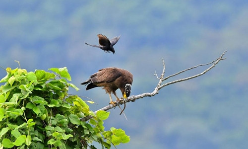 Nhiếp ảnh gia chụp sinh vật hoang dã Liu Chia-Pin ghi lại cuộc chạm trán giữa diều hoa Miến Điện với chèo bẻo đen ở Đài Bắc, Đài Loan, Sun hôm 20/7 đưa tin. Chèo bẻo bắt đầu tiếp cận kẻ săn mồi to lớn khi nó đang đậu trên cành cây, tìm cách ăn con rắn mới bắt được.