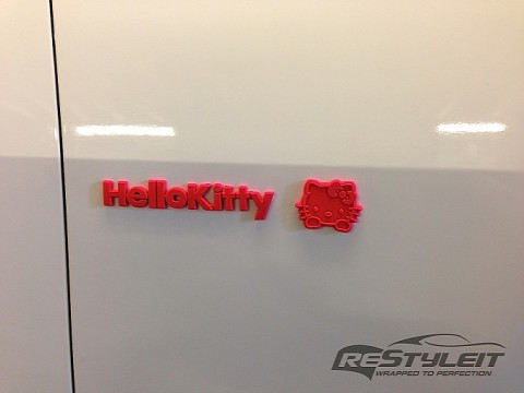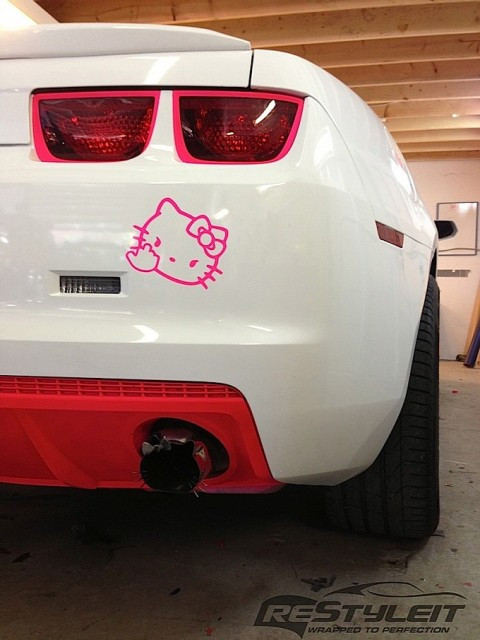 Từ một chiếc Chevrolet Camaro màu đỏ nổi bật, mạnh mẽ và cuốn hút, người ta đã phủ lên nó một lớp sơn và đánh dấu bởi logo con mèo dễ thương Hello Kitty. Tất nhiên để tương đồng, màu sơn trắng sẽ được phối với màu hồng đặc trưng của Hello Kitty.