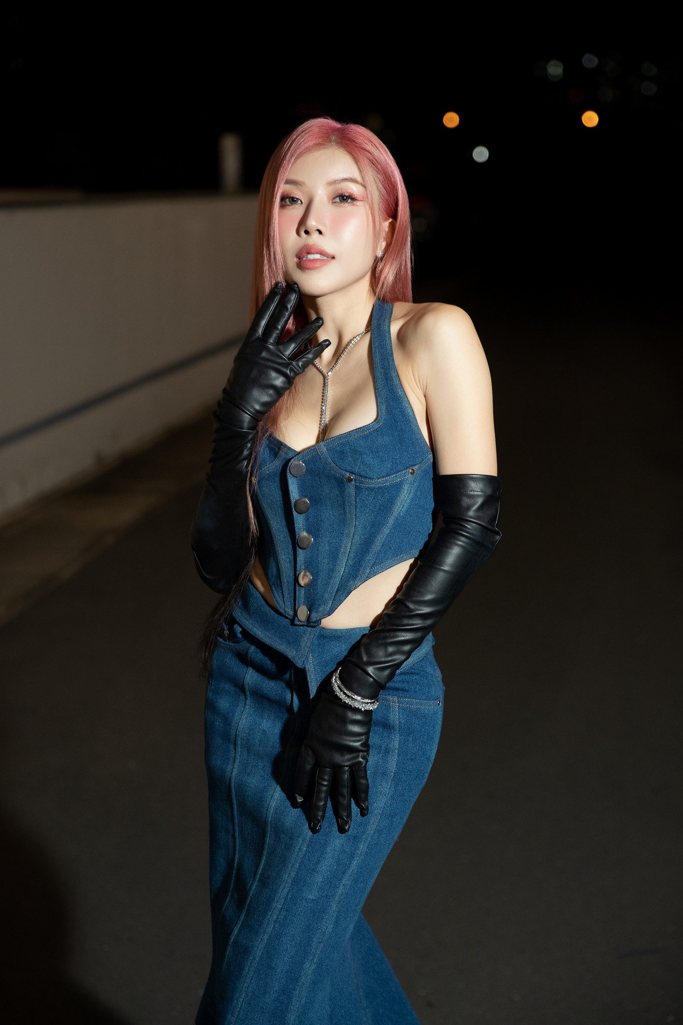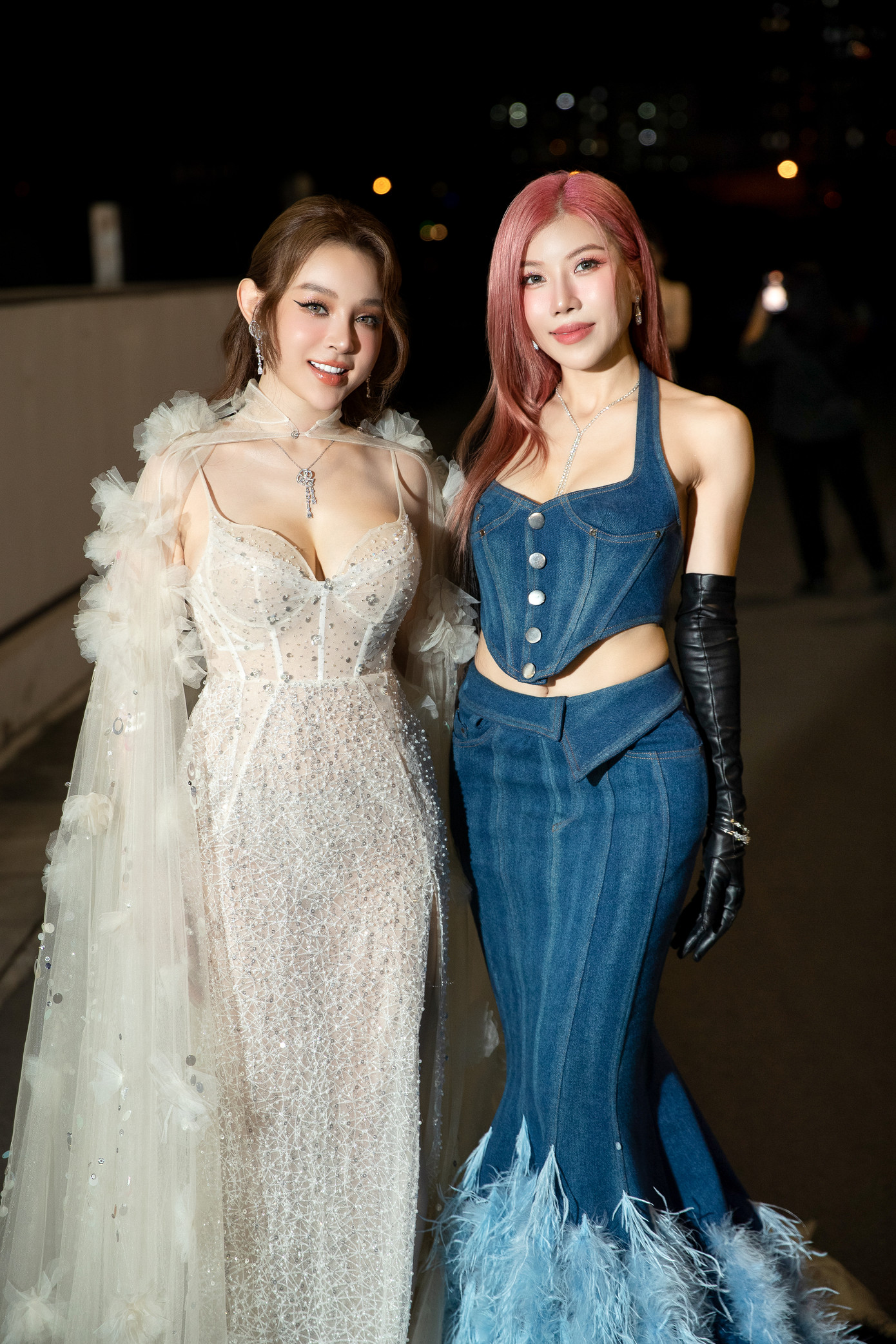 Trước đó, Trang Pháp xuất hiện gây ấn tượng với bộ trang phục denim đuôi cá của nhà thiết kế Lê Long. Cô vui vẻ trò chuyện cùng các chị đẹp Diệp Lâm Anh, Huyền Baby, Tú Vi, Nguyên Hà, Hương Ly…