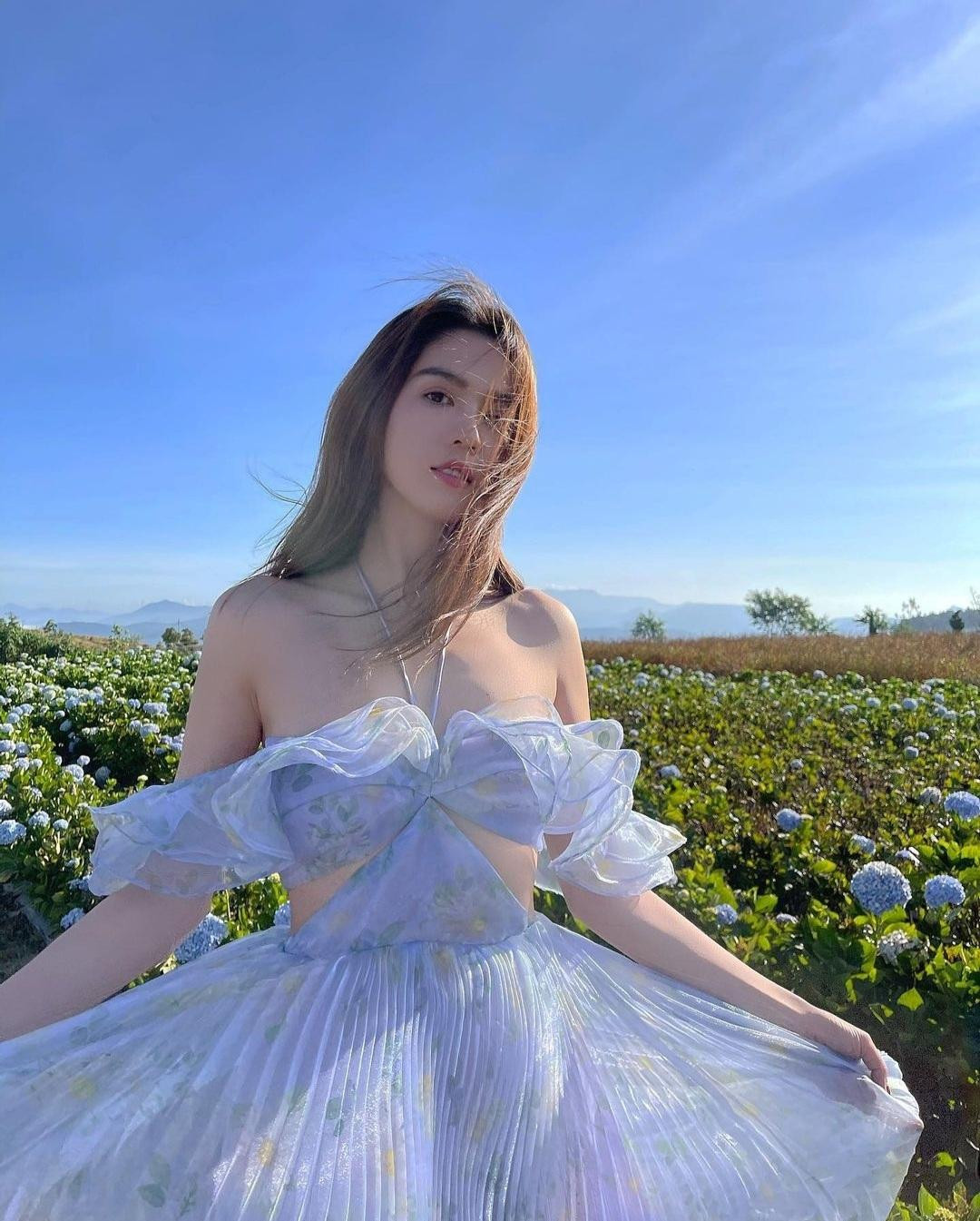 Đầu tháng, người đẹp gây sốt với bộ ảnh theo style “nàng tiên hoa” tại Đà Lạt. Bay bổng với váy hoa trễ vai, Ngọc Trinh trong loạt ảnh này để tóc xõa và trang điểm nhẹ, ghi điểm tuyệt đối trong lòng khán giả.