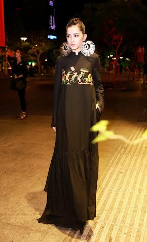 Trên nền vải đen, họa tiết bức tranh "Đám cưới chuột" của làng Đông Hồ được in thêu tỉ mỉ. Phần đuôi áo phối ghép lớp vải chiffon mỏng và độ dài phù hợp giúp Chi Pu khoe vóc dáng thanh thoát.
