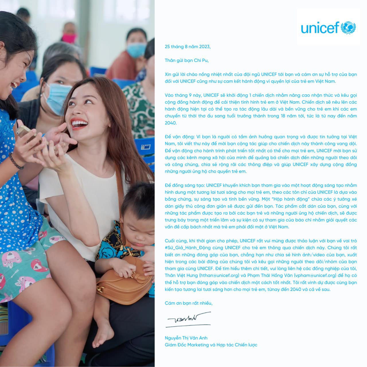 Mới đây, Chi Pu đã xác nhận trở thành 'Sứ giả hành động' cùng đồng hành với UNICEF Việt Nam. Thông qua bức thư gửi đến Chi Pu, tổ chức này bày tỏ mong muốn nữ nghệ sĩ sẽ cùng lan tỏa chiến dịch vì quyền lợi của trẻ em Việt Nam.
