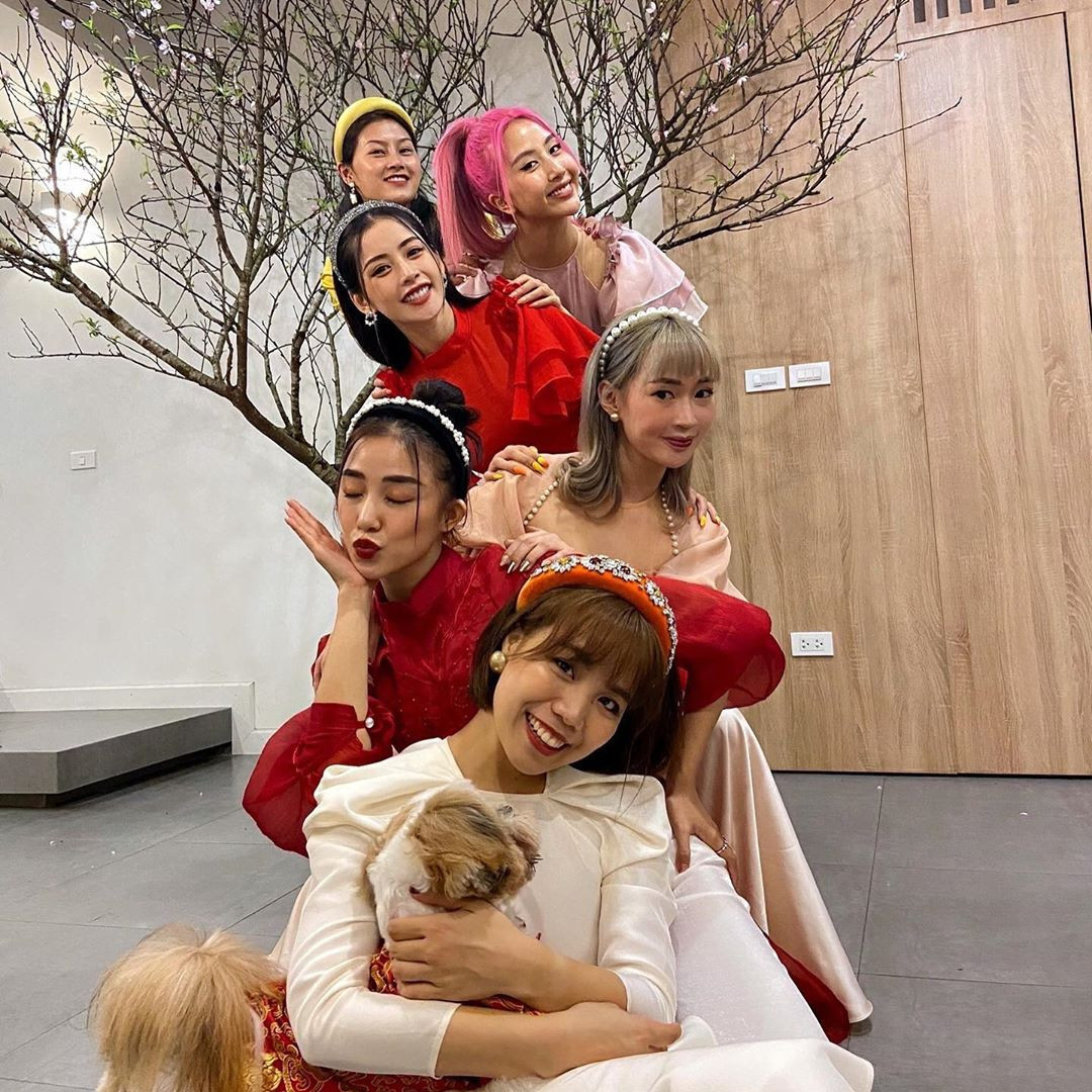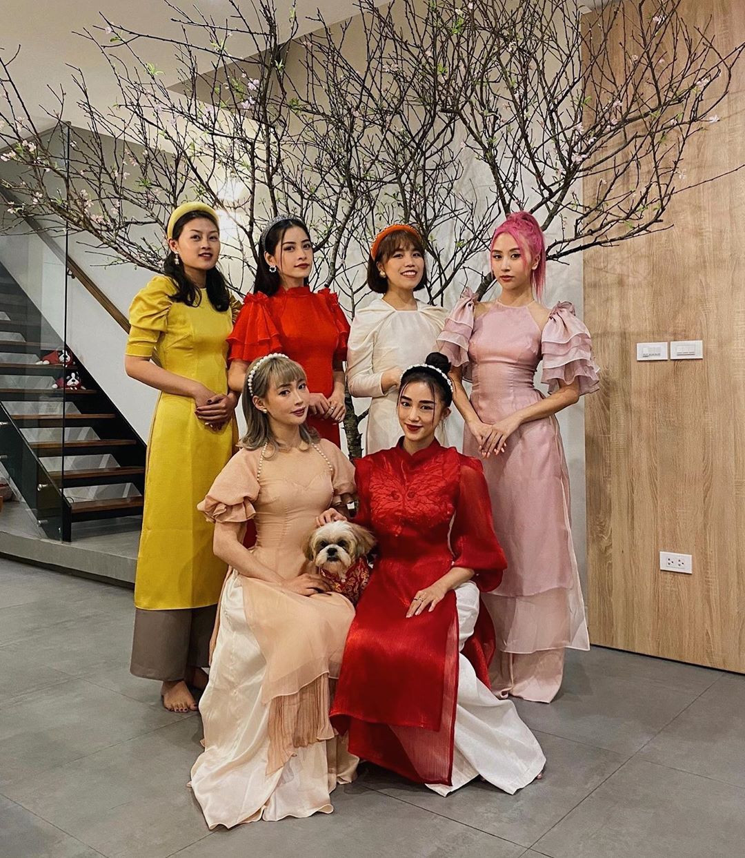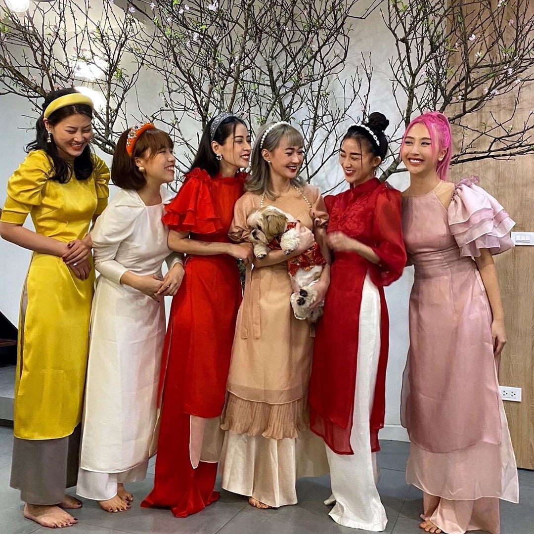 Chi Pu, Quỳnh Anh Shyn, Salim và Sun HT cùng diện áo dài cách điệu duyên dáng bên cây đào mừng xuân. Bộ tứ bạn thân đã có hơn 10 năm chơi cùng nhau và ủng hộ nhau hết mình trong công việc và cuộc sống thường ngày.