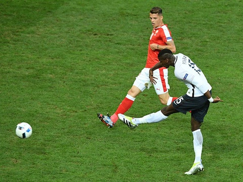 Anh không phải bận tâm phòng ngự nhiều. Bằng chứng là ít khi chúng ta thấy Pogba cố chạy thật nhanh và thật nhiều về sân nhà để phòng thủ. Kể cả khi Thụy Sỹ cầm bóng thì anh vẫn tỏ ra khá thong dong, với những bước chạy lững thững và đủng đỉnh. Thậm chí hai tiền đạo cánh của Pháp lúc đầu trận là Griezmann và Coman còn lùi về phòng ngự sâu và nhiều hơn Pogba!