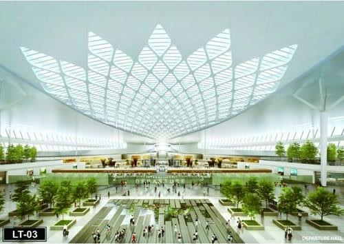 Phương án kiến trúc này lấy ý tưởng từ hình ảnh bông hoa sen cách điệu, sử dụng xuyên suốt trong quá trình thiết kế, áp dụng vào thiết kế mái, phối cảnh từ góc nhìn mặt chính nhà ga, cảnh quan vị trí bên trên mái nhà để xe, nội thất khu vực sảnh làm thủ tục.