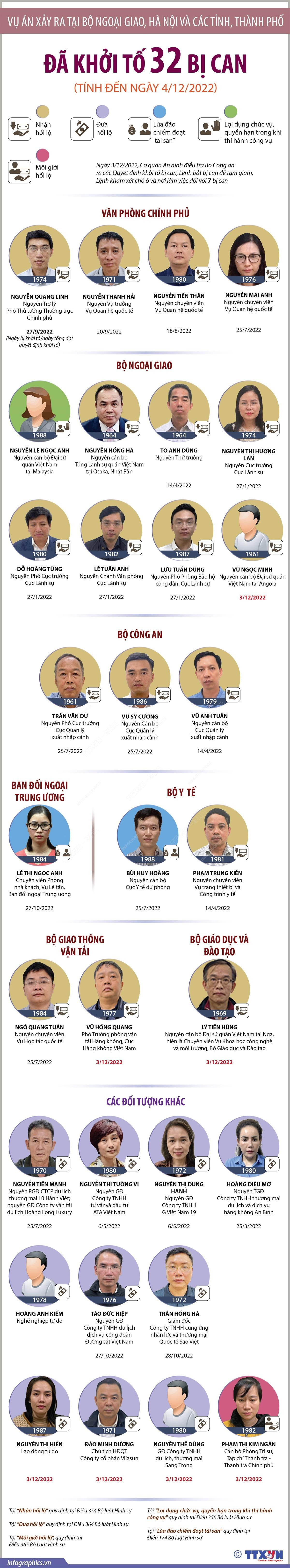 Ngày 3/12, Cơ quan An ninh điều tra Bộ Công an đã ra Quyết định bổ sung Quyết định khởi tố vụ án hình sự “Môi giới hối lộ” (quy định tại Điều 365 Bộ luật Hình sự) xảy ra tại Bộ Ngoại giao, Hà Nội và các tỉnh, thành phố; đồng thời ra các Quyết định khởi tố bị can, Lệnh bắt bị can để tạm giam, Lệnh khám xét chỗ ở và nơi làm việc đối với 7 bị can.