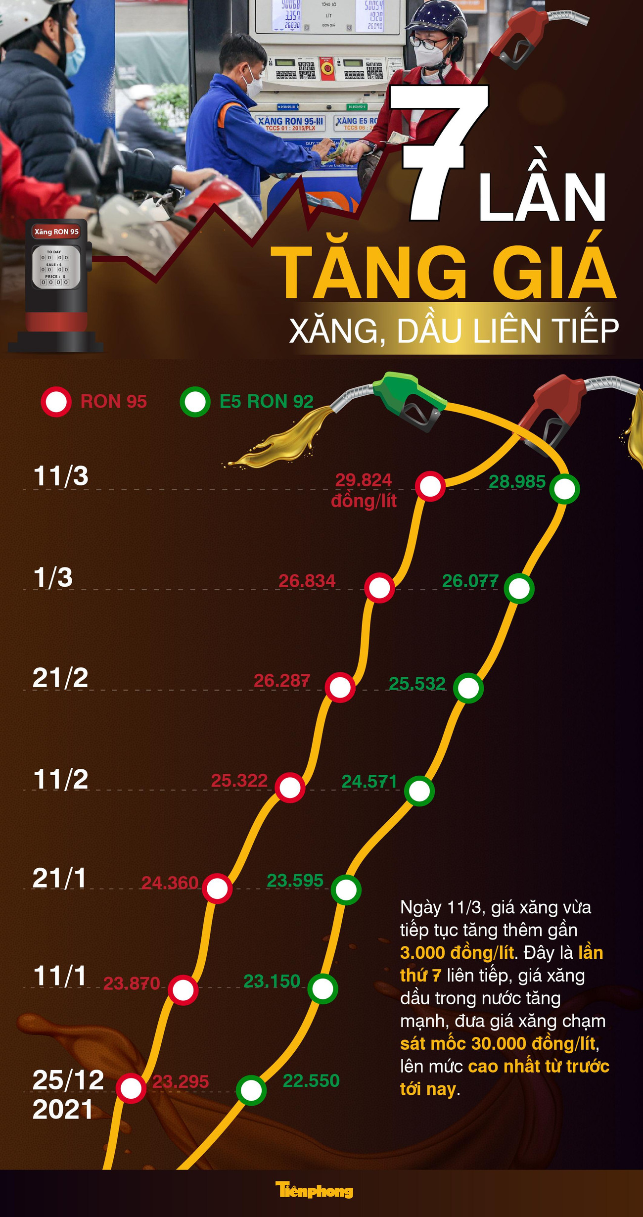TPO - Từ 15h hôm nay (11/3), mỗi lít xăng RON 95 tăng gần 3.000 đồng, lên 29.820 đồng - mức cao nhất từ trước tới nay. Đây là lần thứ 7 liên tiếp, giá xăng dầu trong nước tăng mạnh, đưa giá xăng chạm sát mốc 30.000 đồng/lít.