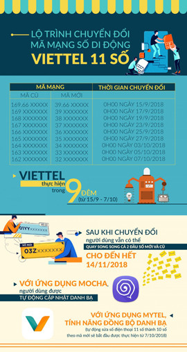 Trong lần chuyển đổi này, Viettel là nhà mạng có số lượng thuê bao lớn nhất với 43 triệu thuê bao. Khi thực hiện chuyển đổi, các thuê bao 11 số của Viettel sẽ chuyển về đầu số 03. Đêm nay, Viettel sẽ thử nghiệm chuyển đổi 100.000 thuê bao 016966. Sau đó, sẽ chuyển đổi trong 8 đêm khác. Cụ thể: