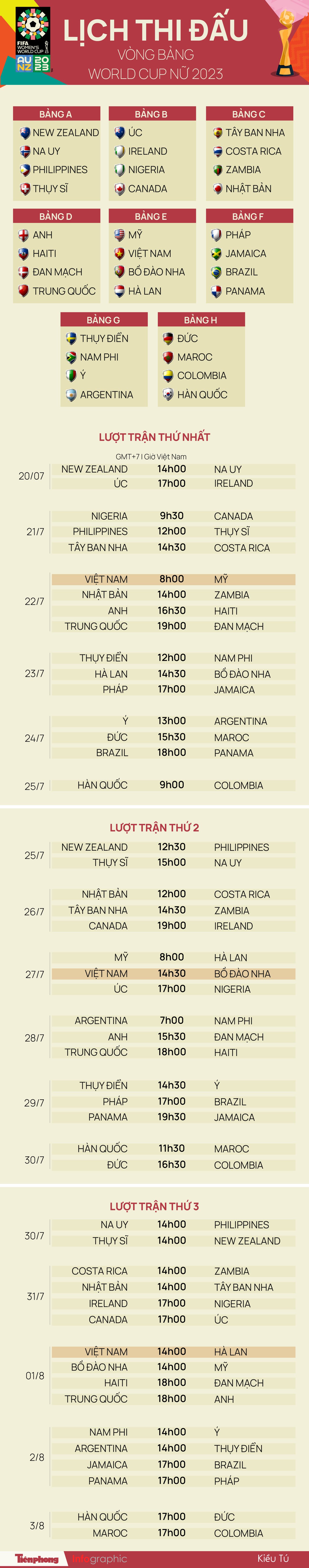 TPO - Đội tuyển nữ Việt Nam lần đầu góp mặt tại vòng chung kết World Cup nữ 2023 diễn ra ở Australia và New Zealand từ ngày 20/7 đến 20/8. Những cô gái chúng ta sẽ đối đầu với tuyển Mỹ, Hà Lan và Bồ Đào Nha. Dưới đây là chi tiết lịch các trận đấu tại vòng bảng World Cup nữ 2023.