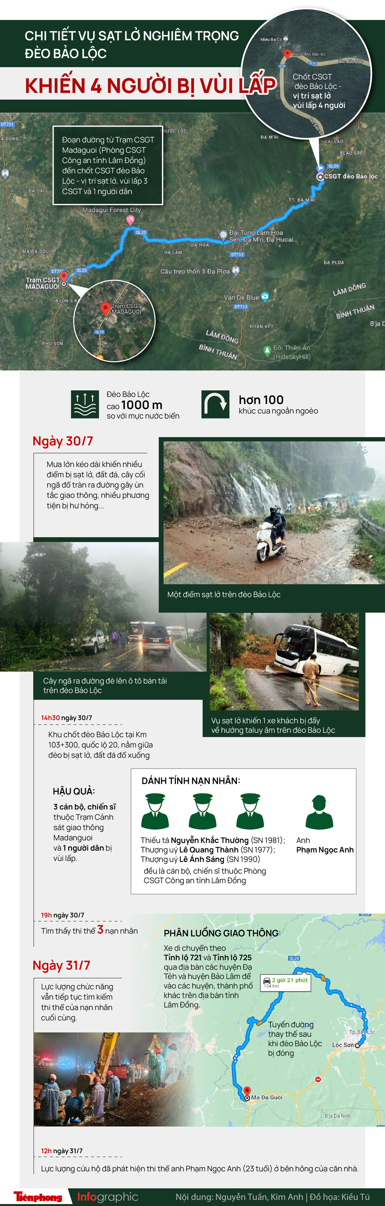 TPO - Lực lượng chức năng đã tìm thấy thi thể 4 nạn nhân trong vụ sạt lở đèo Bảo Lộc - Lâm Đồng, trong đó có 3 cán bộ chiến sĩ cảnh sát giao thông và 1 người dân. Đèo Bảo Lộc dài 10 km trên quốc lộ 20, nối huyện Đạ Huoai với TP. Bảo Lộc. Đây là một trong những đèo hiểm trở nhất Việt Nam.