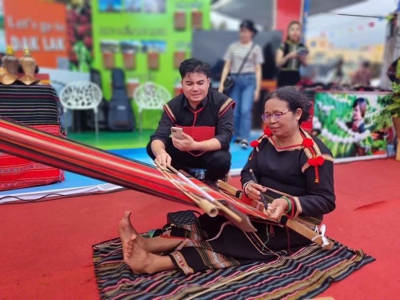 | Các nghệ nhân trình diễn nghề dệt thổ cẩm truyền thống của người Ê đê. |