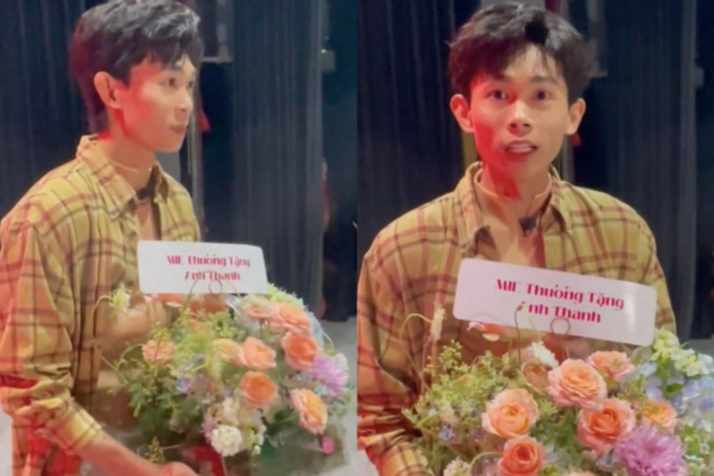 Hình ảnh Hồng Thanh nhận được bó hoa của Mie sau gần 1 năm chia tay khiến netizen không khỏi bàn tán. Tối ngày 11/5, vở kịch Dâu Ngọt có sự tham gia diễn xuất của Hồng Thanh chính thức ra mắt khán giả. Nam diễn viên nhận được bó hoa từ bạn gái cũ cùng lời nhắn nhủ: "Mie thương tặng anh Thanh".