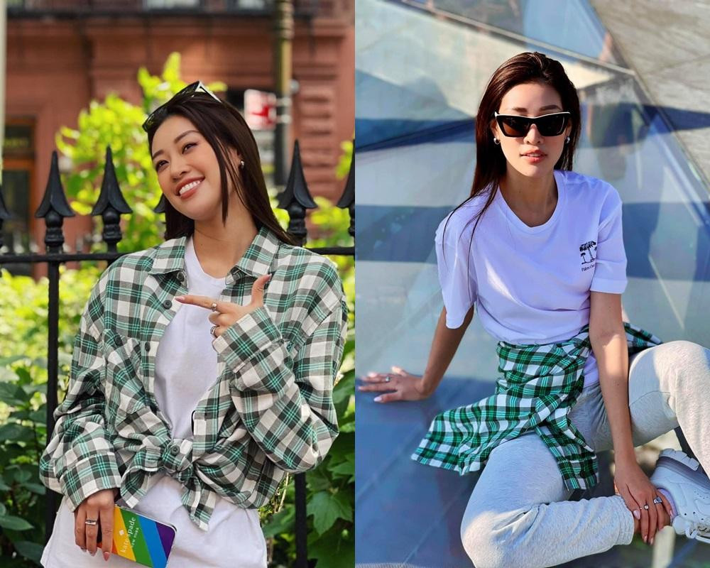 Sau khi “xả vai” thí sinh Miss Universe, Hoa hậu Khánh Vân cũng thay đổi luôn tủ quần áo của mình khi ưu tiên cho những trang phục đơn giản, khỏe khoắn và tiện dụng cho những ngày khám phá nước Mỹ.