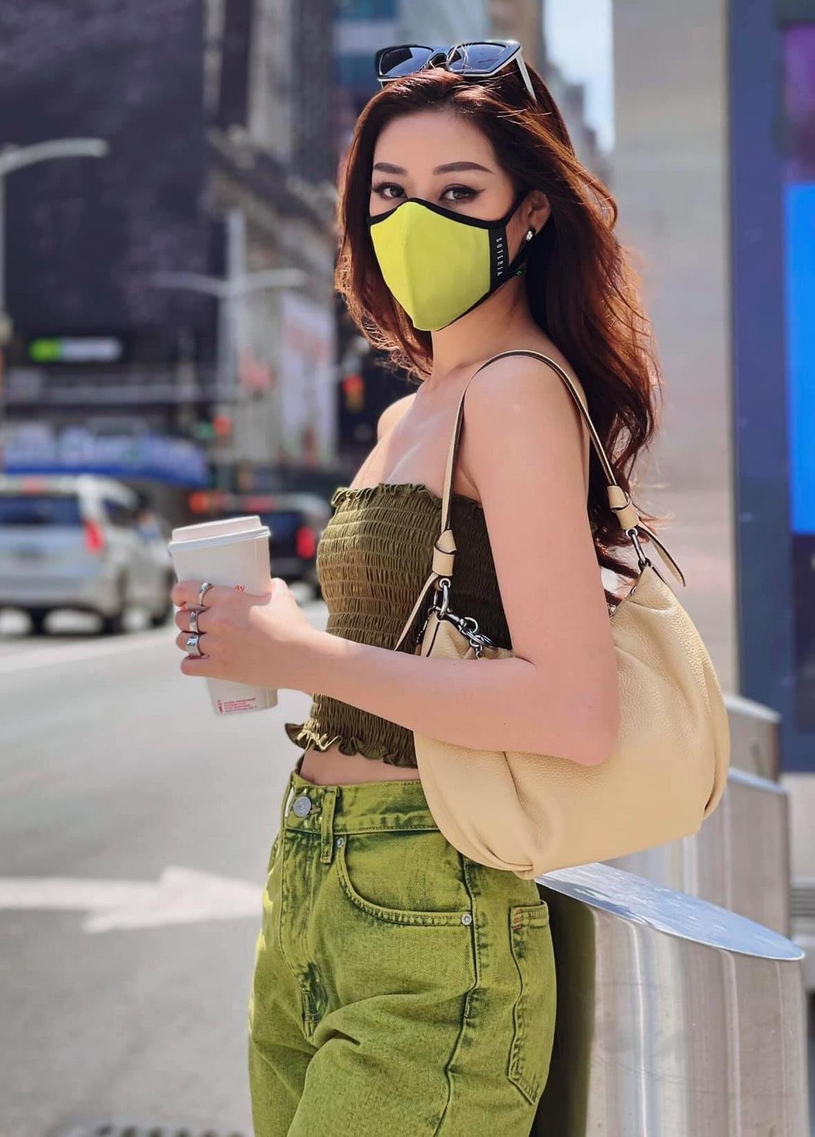 Bộ đồ tông xanh rêu này giúp Khánh Vân nhìn đầy hiện đại, khoe trọn vẹn vóc dáng thon thả của nàng Hậu. Cô còn ghi điểm khi chọn khẩu trang cùng màu với trang phục.