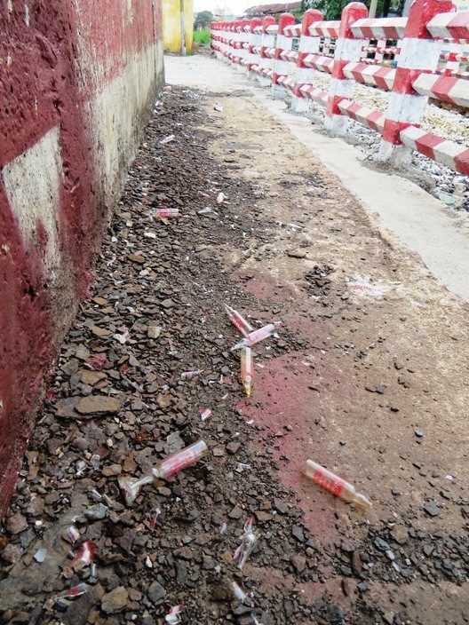Sau mỗi lần tiêm chích số bơm kim tiên, vỏ thuốc bị vứt rải rác đầy trên cầu Quay, đường sắt. Nhiều người đi qua đây không khỏi kinh hãi.